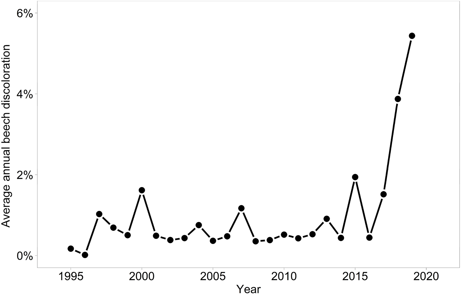 Development of mean discoloration of beech in monitoring plots.