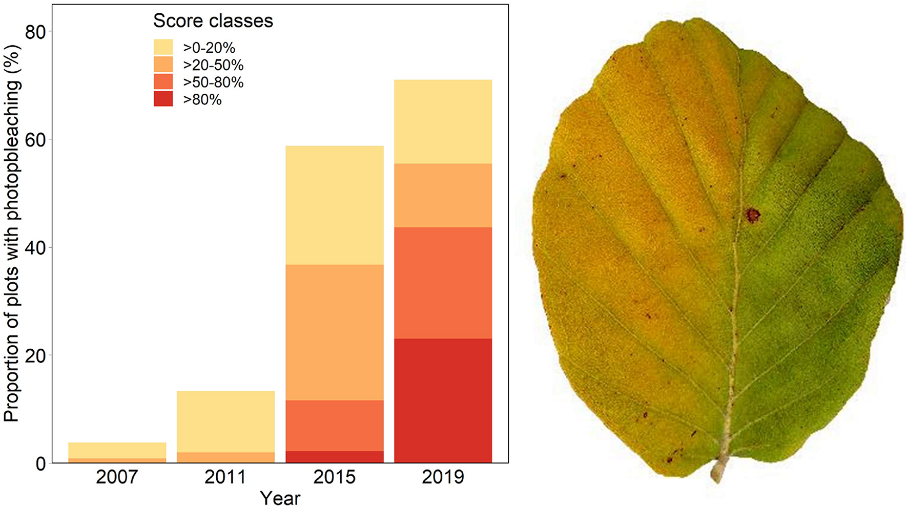 Frequency of occurrence of photobleaching (left) and leaf with sign of strong photobleaching (right): the right half of the leaf was covered by another leaf.