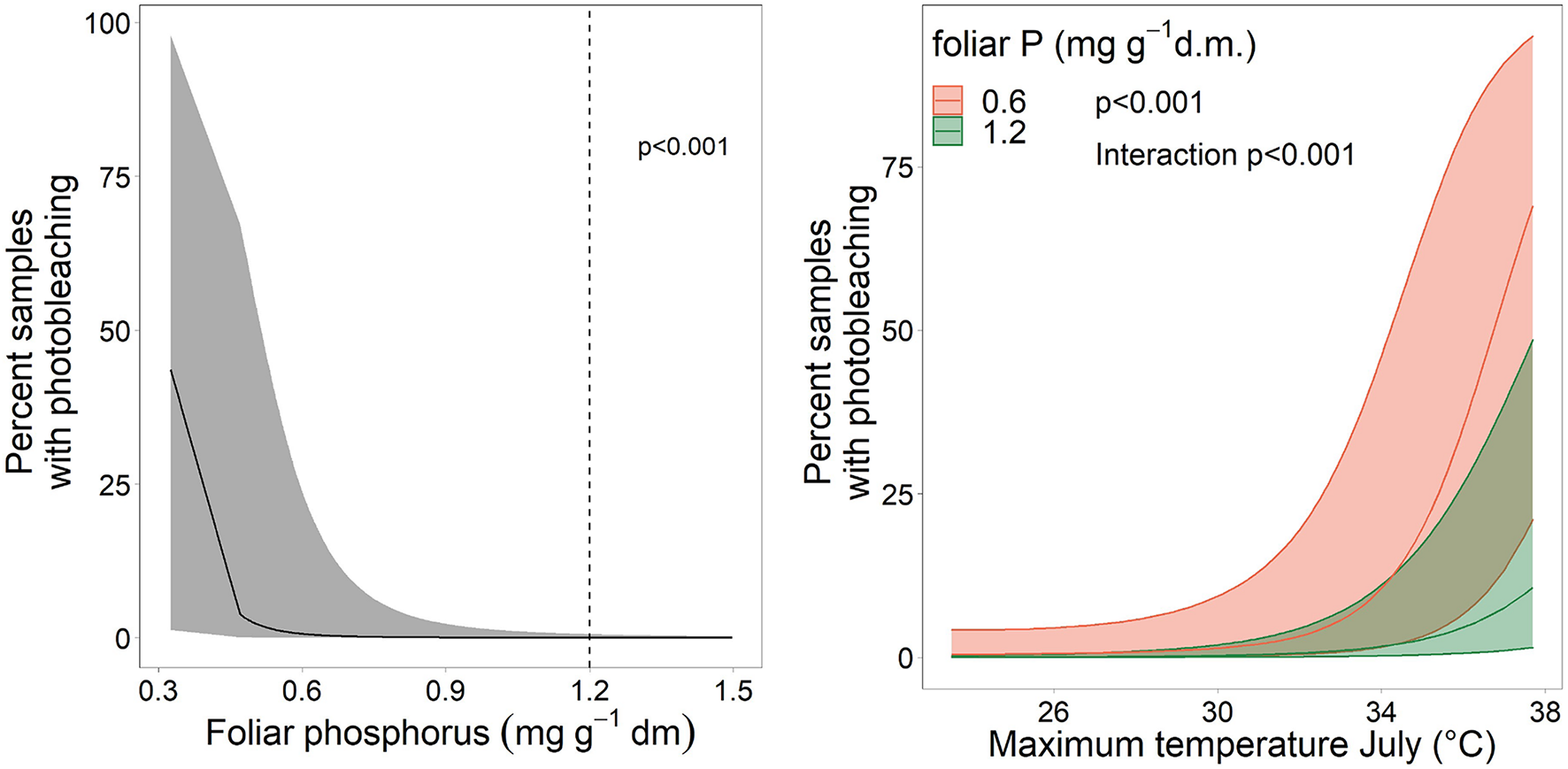 Left: Relation between the proportion of samples with photobleaching and the foliar concentration of P as spline function with two knots. The dotted line gives the lower threshold for normal nutrition according to Göttlein (2016). Right: Illustration of the interaction between maximum July temperature and foliar P concentration on photobleaching.