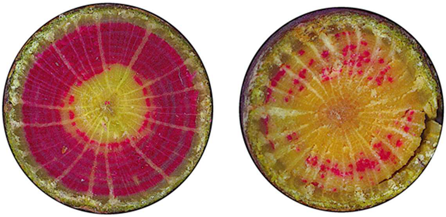 Staining of active vessels of beech: examples of a beech with crown transparency of 20% (left) and 70% (right).