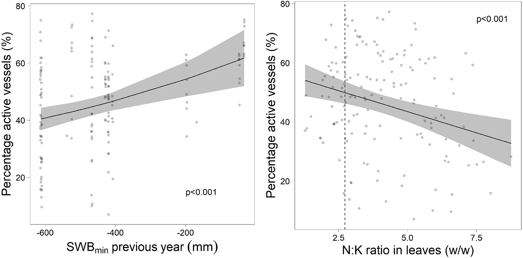 Proportion of active vessels in relation to the drought in the previous year (left) and the foliar ratio of N:K (right). The dotted line gives the upper threshold for harmonic N:K ratio according to Göttlein (2016).