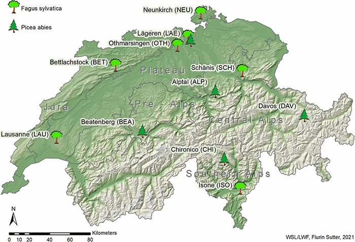 Locations of the 11 study plots distributed across Switzerland with the investigated main tree species European beech (Fagus sylvatica) and Norway spruce (Picea abies).