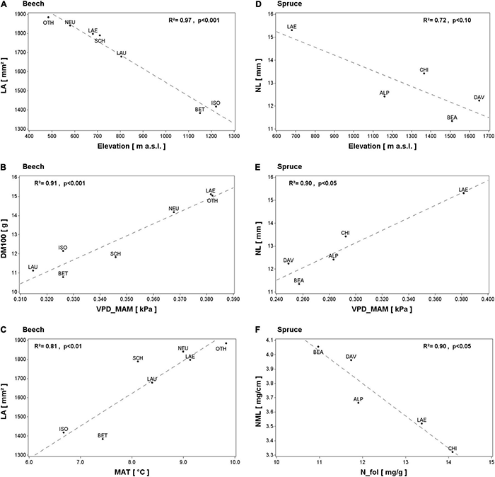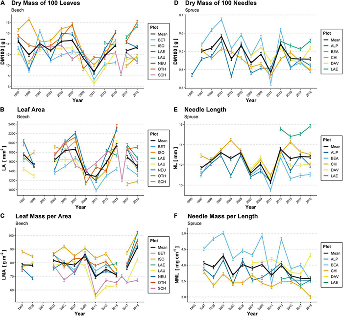 The main aims of this study were, therefore, to determine the (1) spatial and (2) temporal variation in LMTs of beech and spruce across different forest plots, and (3) to identify the potential drivers of LMT variations. We made use of archived foliar material as whole leaves and needles that was collected biennially within the Swiss Long-term Forest Ecosystem Research network (LWF, e.g., Schaub et al., 2011) from 1995 to 2019. Based on this unique foliar collection, we built a LMT chronology for investigating dry weight, LA or NL, and LMA or needle mass per length (NML) for six beech and four spruce plots and one mixed forest plot. We combined this LMT data set with plot variables (e.g., elevation and stand age) and long-term data covering climatic variables and drought indices, foliar nutrient and carbon (C) concentrations, and other tree-trait parameters (e.g., fruiting intensity and crown defoliation) to identify the main spatial and temporal drivers of LMT variations.