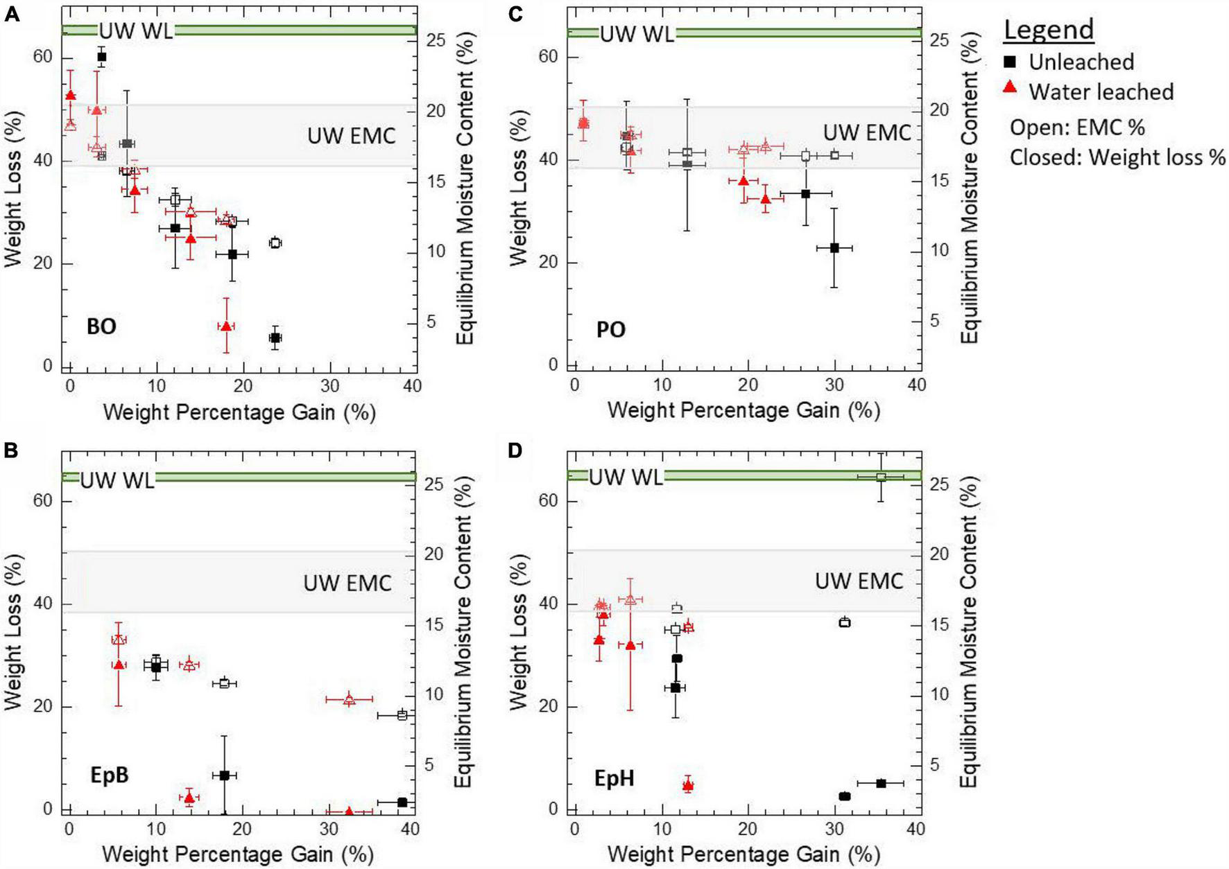 Effect of modification level, in terms of weight percentage gain, on the weight loss caused by brown rot fungal exposure after 12 weeks (left y-axis) and the average EMC at 90% RH and 27°C after modification (right y-axis). Samples were modified with (A) butylene oxide (BO), (B) epoxybutene (EpB), (C) propylene oxide (PO), and (D) epichlorohydrin (EpH). Weight loss was corrected for non-fungal weight loss contributions. Unmodified wood (UW) values are also shown.