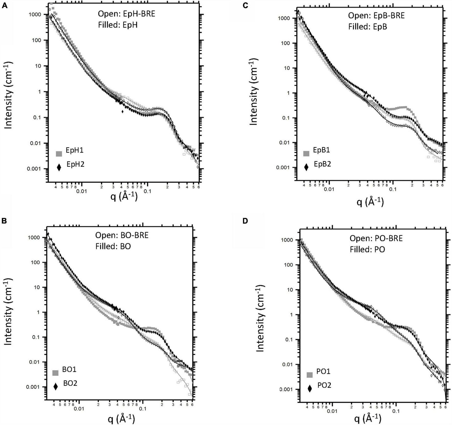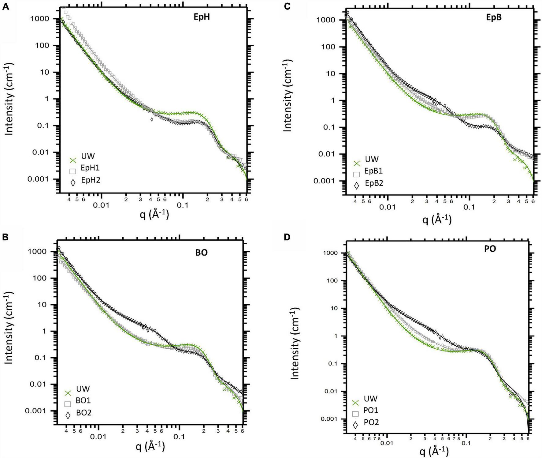 For some of the more heavily modified samples (such as PO2, EpB2, and BO2), a scattering shoulder feature was detected within the q-range of 0.015–0.035 Å–1, thus, a Guinier feature was added to the model to account for this contribution (Eq. 2) (Beaucage, 1995).