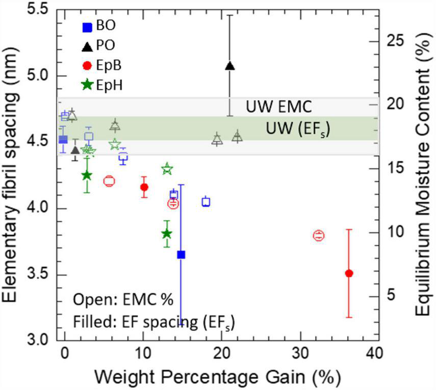Effects of alkylene oxide modification on the elementary fibril spacing (EFs). The effects of the chemical modification on the average EMC at 90% RH and 27°C are shown on the right y-axis. Modifications include propylene oxide (PO), butylene oxide (BO), epoxybutene (EpB), and epichlorohydrin (EpH). Values for unmodified wood (UW) are also shown.