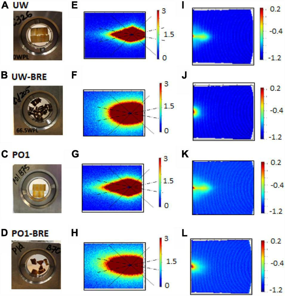 Combined effects of chemical modification and brown rot fungal exposure (BRE) on the samples and their corresponding main (E–H) and wing (I–L) detector images. Titanium loaded cells with unmodified wood (UW) before (A) and after fungal exposure (B), as well as propylene oxide (PO) modified wood before (C) and after exposure (D). Detector scattering patterns for UW (main: E,F; wing: I,J) and PO (main: G,H; wing: K,L).