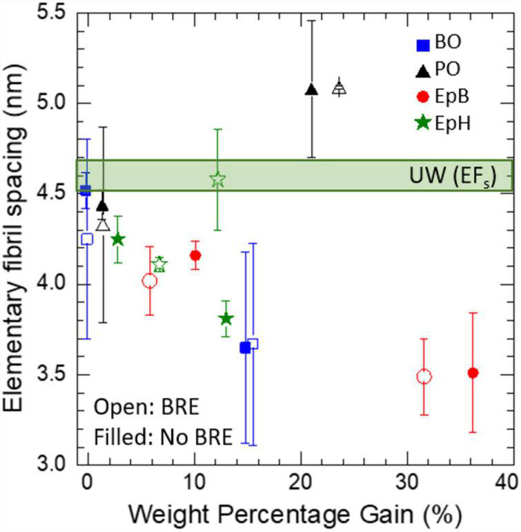 Combined effects of alkylene oxide modification and brown rot exposure (BRE) on the elementary fibril spacing (EFs). Error bars corresponds to the uncertainty in the diffraction peak position with respect to variations in the fitting parameters, so the peak position of weaker diffraction peaks will have larger error bars. Modifications included: epichlorohydrin (EpH), epoxybutene (EpB), butylene oxide (BO) and propylene oxide (PO). Unmodified wood (UW) values are also shown.