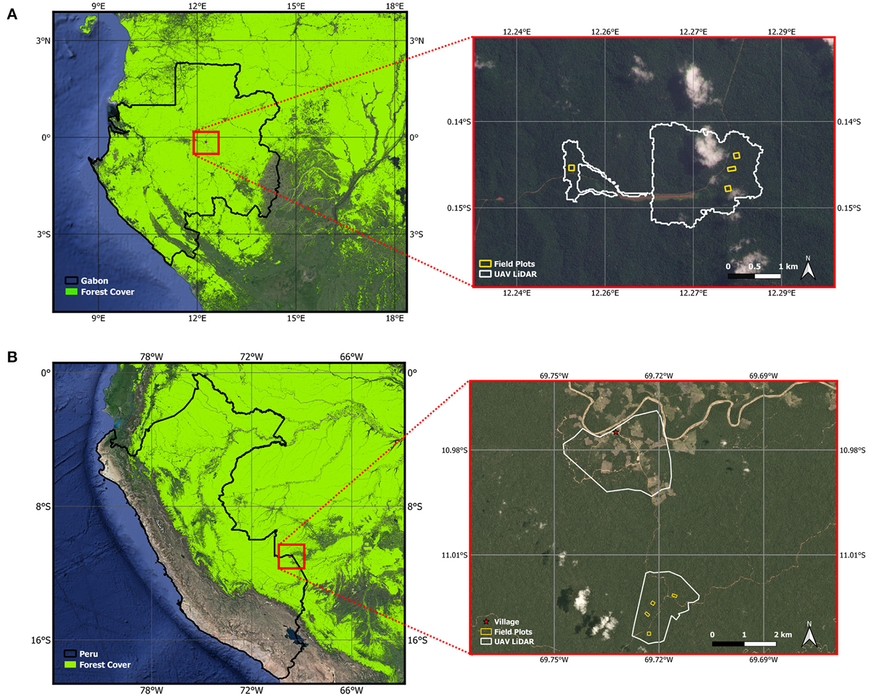 Location of the two study areas in (A) Gabon and (B) Peru. The left panels show the position of the field sites within the country boundaries. The layer in bright green is the primary humid tropical forest extent for the year 2001 from Turubanova et al. (2018). The right panels show the location of the forest plots (yellow boxes) and the area covered by the UAV LiDAR acquisitions (white). Both RGB images of the field sites date to May 2022 and are 3 m PlanetScope images acquired through Planet's Education and Research Program (Planet Team, 2017).