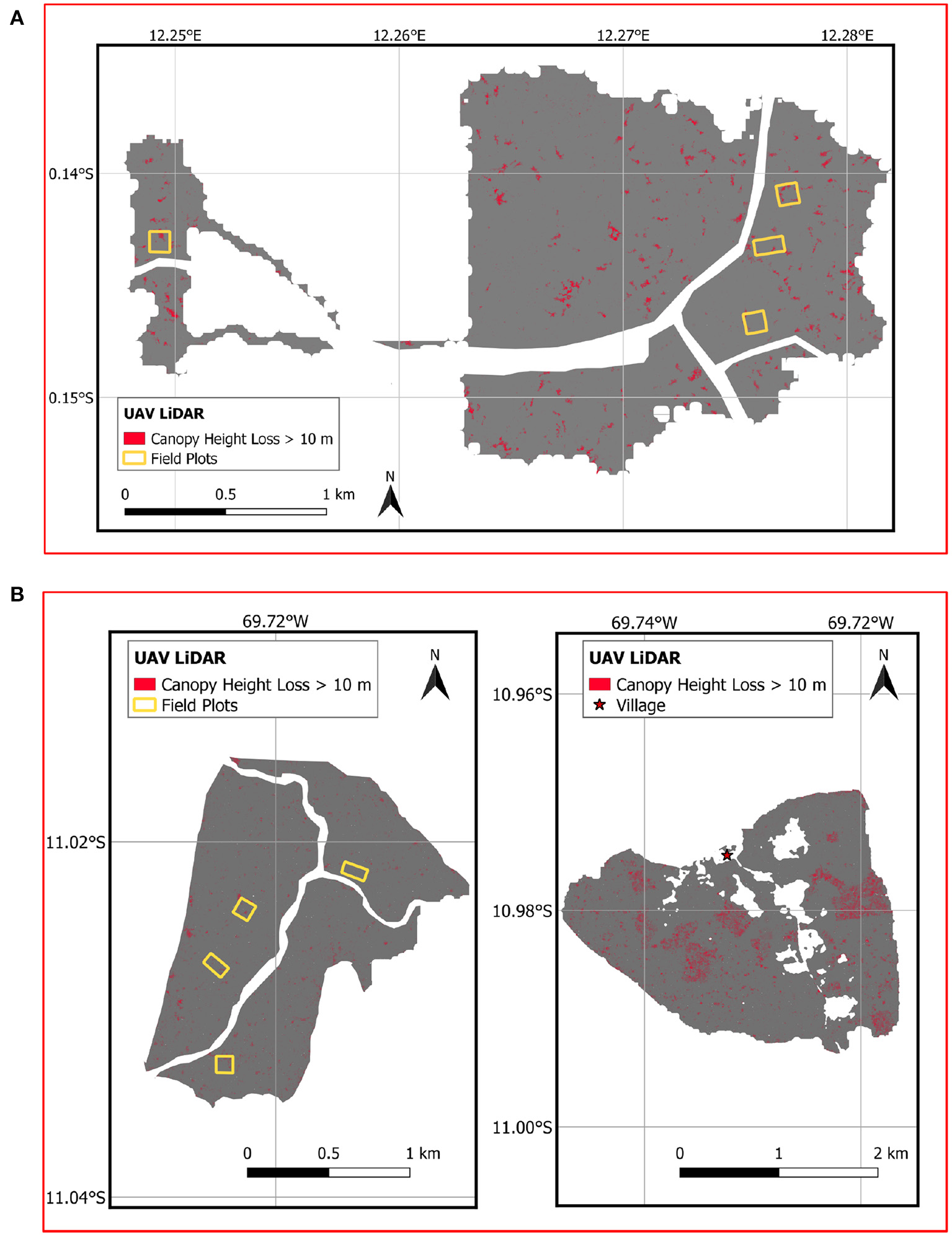 Canopy height change from UAV LiDAR measurements (gray image) showing losses in forest canopy height of more than 10 m (red). (A) Canopy height loss in Gabon from January 2020 to January 2021 indicating patches of disturbance in the study plots and in the surrounding concession; (B) Canopy height loss in Peru from May 2019 to September 2021, showing fine-scale losses in the area of the study plots (left panel) and more intensive, consistent patterns of forest to agriculture conversion in proximity of the village (right panel).