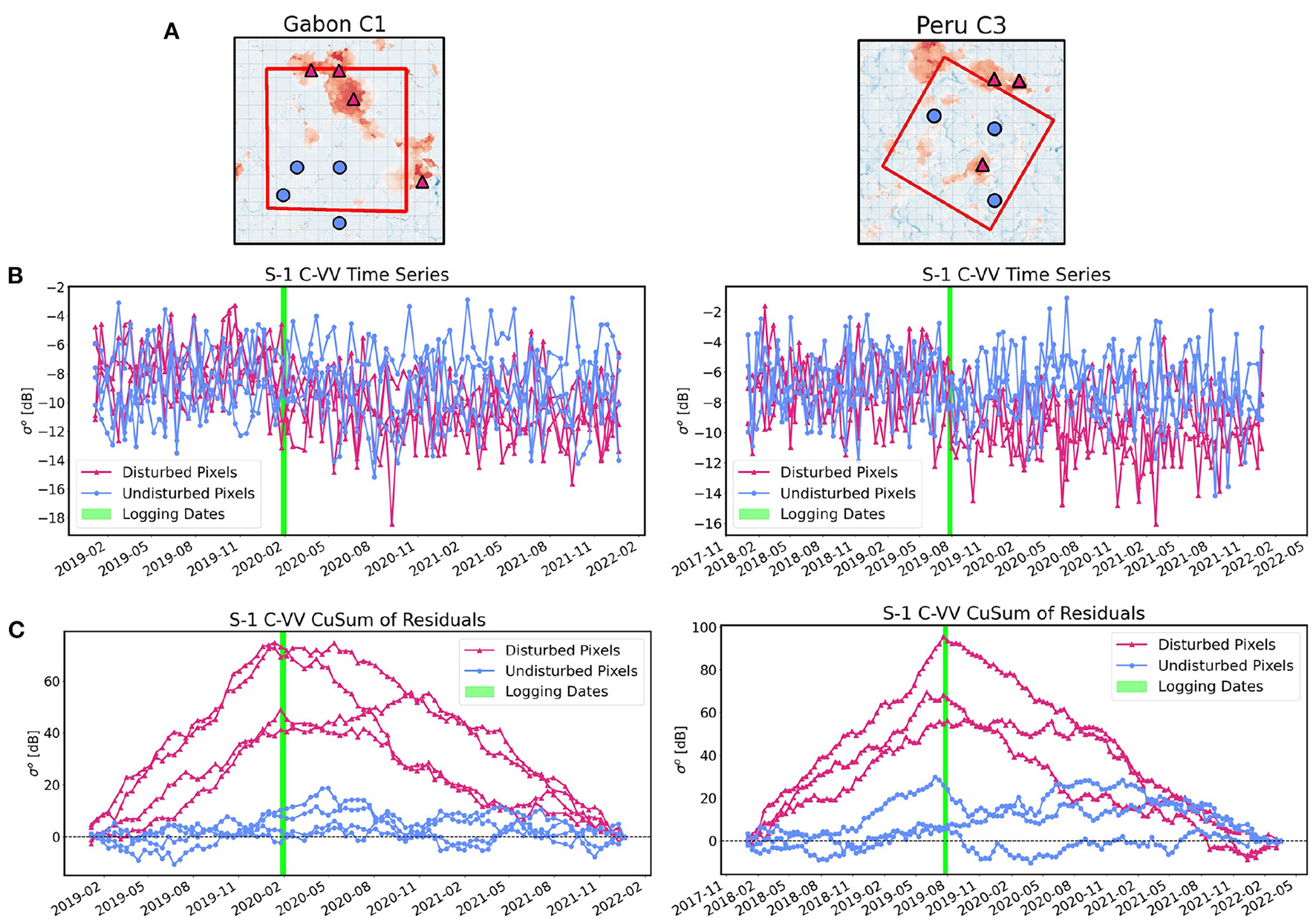 Comparison of disturbed and undisturbed pixels for selectively logged plots in (left) Gabon and (right) Peru. (A) Location of the disturbed pixels (purple triangles) and undisturbed pixels (blue circles) on the Canopy Height Change raster from the UAV LiDAR measurements. Disturbance areas on the LiDAR map are indicated in dark red. (B) Time series of Sentinel-1 (S-1) SAR backscatter values for the disturbed and undisturbed pixels. (C) CuSum curves for the disturbed and undisturbed pixels. Pixels where logging activities took place display a bell-shaped curve peaking around the time of logging (green line).