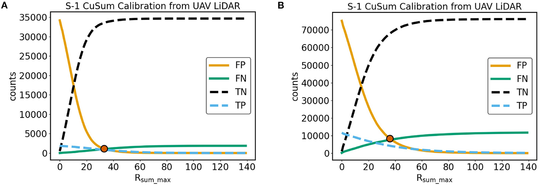 Calculating the value of the CuSum maximum (Rsum_max) from Sentinel-1 (S-1) time series that would minimize both False Positive (FP) and False Negative (FN) change detections in (A) Gabon and (B) Peru. The optimum value is indicated by a circle at the point of intersection between the FP and FN curves. Change is defined as a canopy height loss ≥ 10 m as derived from a UAV LiDAR ΔCHM raster resampled to 10 × 10 m pixels. The counts in Peru are double the size than Gabon as here the S-1 time series spans 2 years, consistently with the timeframe of the UAV LiDAR acquisitions. True Positive (TP) and True Negative (TN) curves are also shown in this Figure.