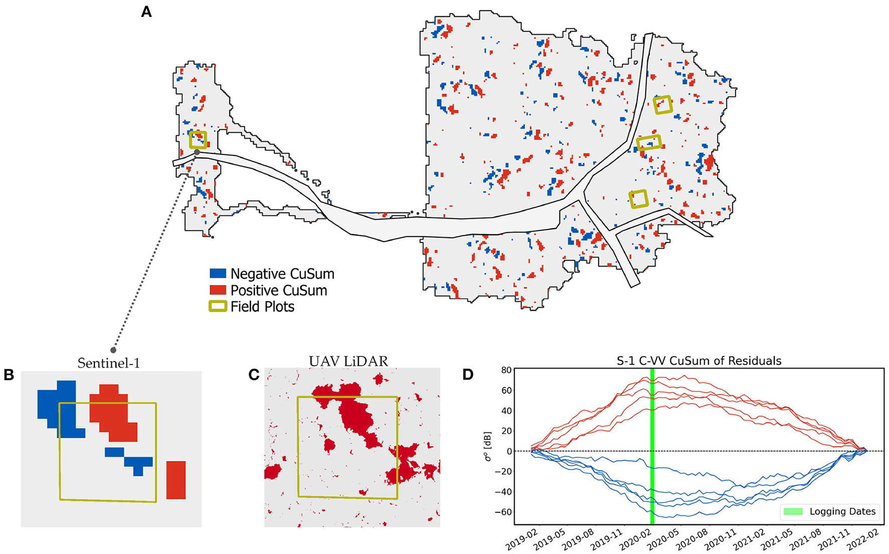 The CuSum algorithm is recognized as a powerful statistical method for detecting abrupt and systematic changes in time series data (Page, 1955; Taylor, 2008; Manogaran and Lopez, 2018). While being extensively used for monitoring market trends and industrial processes (Manly and Mackenzie, 2003), it has recently found applications in the environmental sciences for detecting seasonal climate changes (Manogaran and Lopez, 2018) and for monitoring deforestation and forest degradation in temperate (Kellndorfer et al., 2019; Ruiz-Ramos et al., 2020) and tropical forests (Ygorra et al., 2021). Results from Ruiz-Ramos et al. (2020) and Ygorra et al. (2021) have shown the robustness of this method for detecting cover changes in forest canopy, with overall accuracy of 77% and 91%, respectively. However, the data they used to obtain these numbers were produced by visual interpretation of optical satellite imagery, which presents many limitations. Even in 3 m resolution PlanetScope images, degradation effects preceding deforestation cannot be immediately detected, especially in the case of dense and multi-storied canopies. Moreover, and this is particularly relevant in tropical environments, canopy gaps can quickly recover in between two cloud-free images, resulting in a large underestimation of actual forest disturbances (Asner et al., 2004; Shimizu et al., 2019; Ygorra et al., 2021). By contrast in this study we use very high resolution (25 cm) in-situ data from UAV LiDAR to validate the CuSum method in its ability to detect subtle changes in forest canopy resulting from low-intensity logging.
