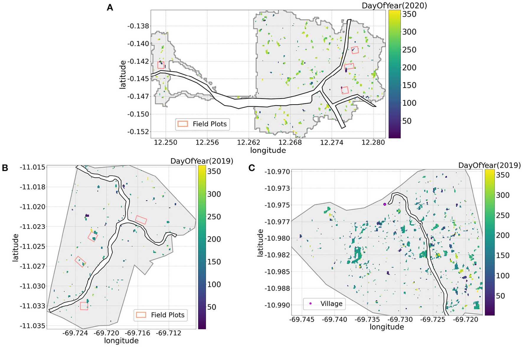 The position of Rsum_max in the CuSum chart corresponds to the moment in time immediately before backscatter intensity drops below the historical average. As a result, the time of the disturbance event was derived by selecting the date of the image that follows the date of the inflection point in the time series. Disturbance events were filtered to retain only change pixels within a single year. This was chosen as the year when selective logging occurred in the permanent sample plots, i.e., 2020 for Gabon and 2019 for Peru. Figure 7 shows the timing of the change detections, in units of Day of Year (DOY), in both our study areas. In Gabon, the field plots were selectively logged at the end of January 2020, while commercial logging operations in the surrounding area were carried out between November and December 2020, in coincidence with the second dry season (Figure 7A). In Peru, selected trees were extracted from the study plots during the second part of July 2019, while the rest of the area remained mostly undisturbed (Figure 7B). More significant patches of disturbance are observed near the village during a period going from June to August (Figure 7C). Indeed this time frame corresponds to the peak of the dry season, when forests fringes are cleared for agricultural fields and pasture. These observations have been further confirmed by inspection of PlanetScope imagery and conversations with the Bélgica community.