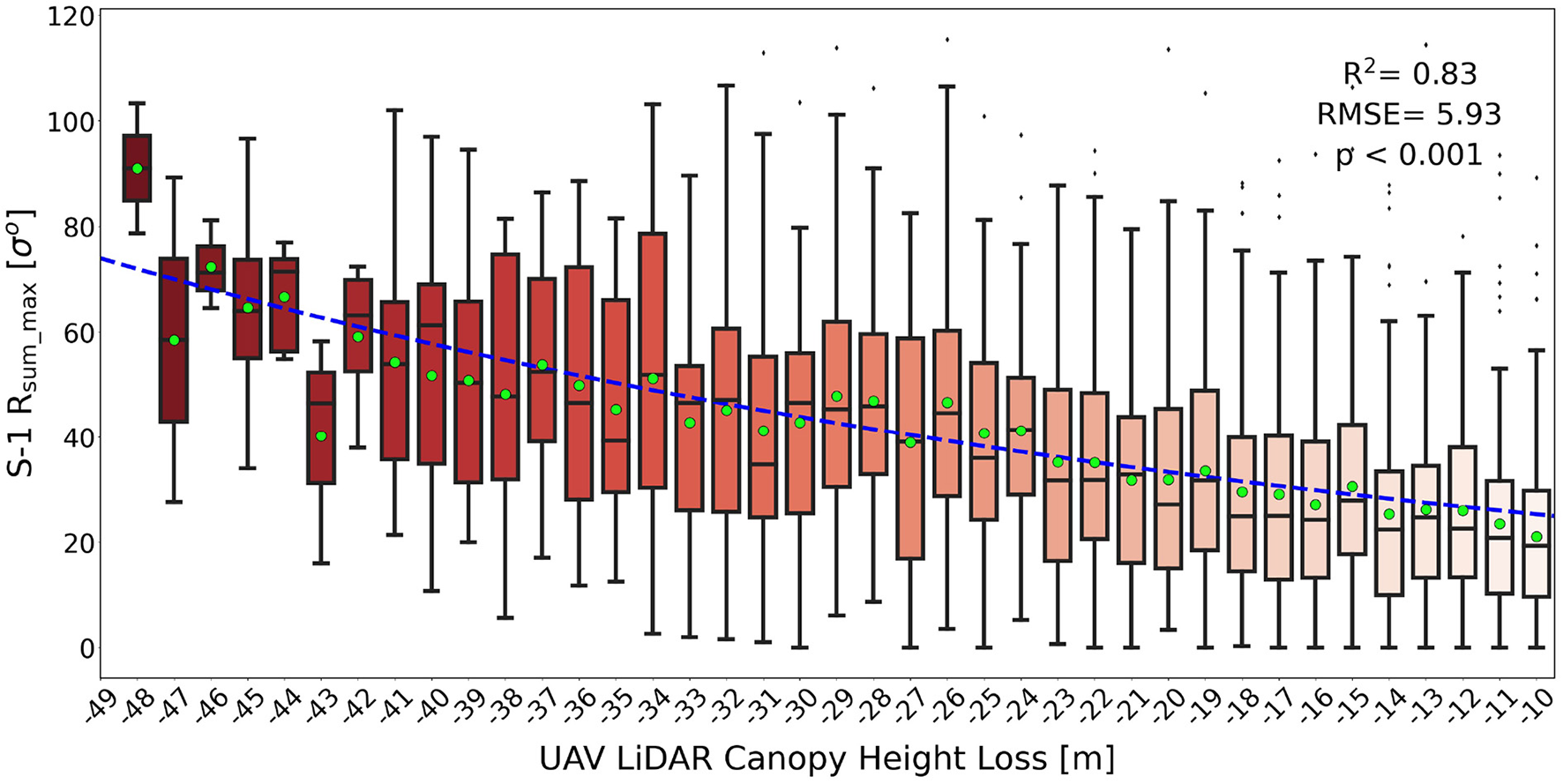 Previous work had successfully correlated decreases in L-band radar backscatter to structural changes in vegetation cover (Mitchard et al., 2011a; Ryan et al., 2012; Joshi et al., 2015). However, biomass estimation in tropical forests is inherently limited by the saturation of the radar signal (Mermoz et al., 2015). Shorter wavelength C-band data is generally considered less useful because of even lower penetration depth, as compared to L-band radar (Le Toan et al., 2004; Woodhouse, 2017). On the other hand, Figure 3 shows CuSum curves of logged pixels peaking at different values of σo, possibly indicating a variation in the intensity of the change event. For this reason, we tested the sensitivity of the maximum of the CuSum curve, Rsum_max, to changes in the AGB values of the study plots, ΔAGB, before and after selective logging. After taking the average value of Rsum_max in each plot, we analyzed its relationship with ΔAGB using a linear regression model, taking ΔAGB (in units of % ha−1) as the dependent variable and Rsum_max as the independent variable. The linear relationship between the two quantities is in the form y = mx+c. Substituting x with Rsum_max from the Sentinel-1 observations (resampled to 1 ha pixels), we obtain ΔAGB values for building a biomass change map of the two regions.
