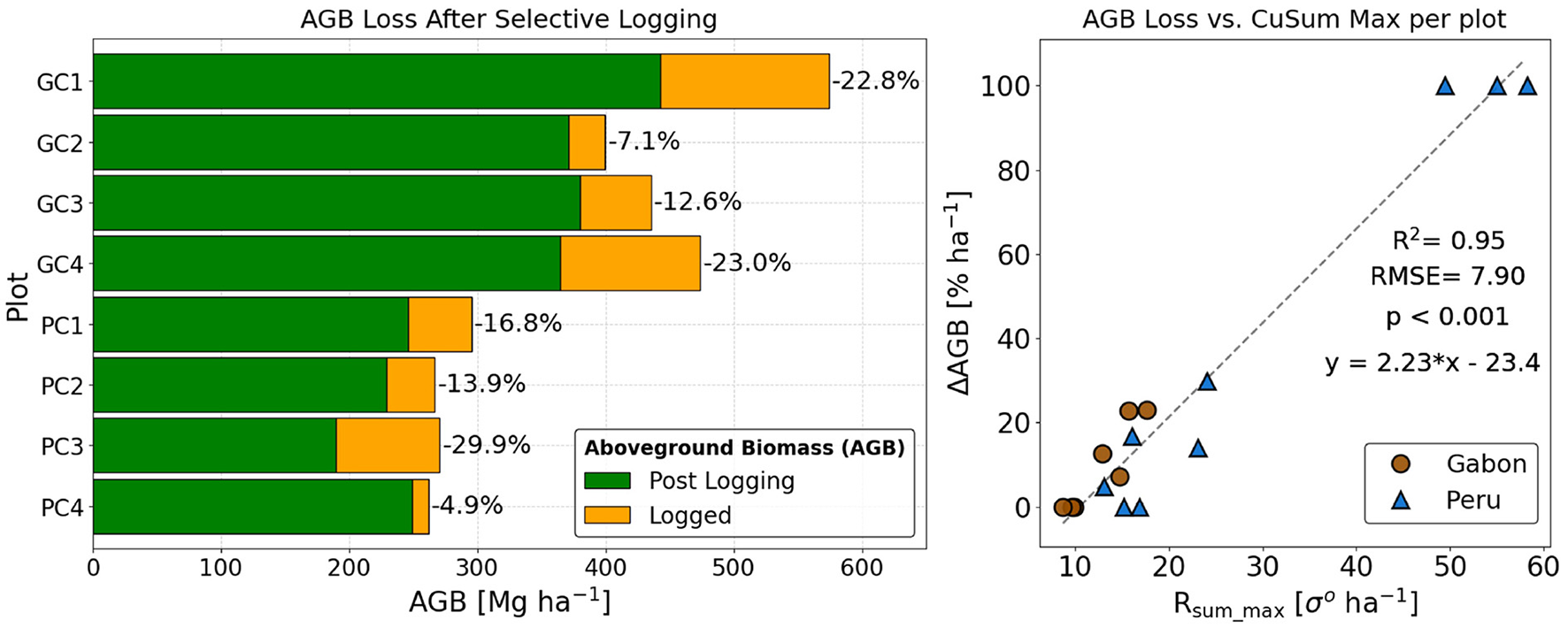 Aboveground Biomass (AGB) before and after logging and Aboveground Biomass Change (ΔAGB) figures for eight 1-ha selectively logged plots located in Gabon (G) and Peru (P), obtained by field surveys and Terrestrial Laser Scanning (TLS).