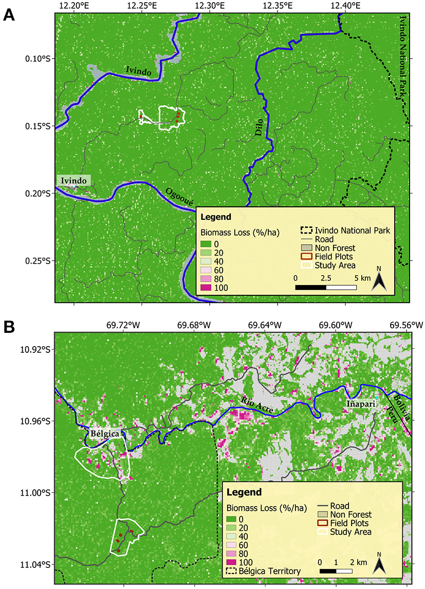 In Gabon, UAV LiDAR data were obtained in January 2020, prior to selective logging in the permanent plots, and then in January 2021, to measure the widespread disturbance resulting from commercial logging operations in proximity of the airstrip, which took place between November and December 2020. In Peru, the first UAV LiDAR campaign took place in May 2019 in conjunction with the pre-logging census. The post-logging LiDAR data were acquired in September 2021, accounting for changes in canopy cover due to selective logging in the study plots and agricultural encroachment in the forest fringes near the village area. For both Gabon censuses, and the first Peru census, a RIEGL miniVUX-1DL LiDAR mounted on a DELAIR DT26X fixed-wing UAV was flown at 140 m above the ground and at a speed of ≈17 ms−1, yielding a point density of 240 pts m−2. For the post-logging campaign in Peru a LiDAR RIEGL Minivux-2UAV mounted on a rotor craft was used for the UAV data collection, yielding a point density of 200 pts m−2. Flight trajectories were corrected using post-processing kinematic (PPK) positioning from ground control points and a GNSS base station, resulting in a geometric accuracy of 1.8 cm (McNicol et al., 2021). Canopy height models (CHM) for a total area of 1,239 ha (354 ha in Gabon and 885 in Peru) were generated by taking the difference between the highest and lowest returns in a 25 cm cell and after noise filtering (McNicol et al., 2021). For each site, a ΔCHM raster was obtained by taking the difference between the pre- and post-logging CHMs. Losses in canopy cover were identified as in areas where ΔCHM decreased by 10 m or more (Figure 2).