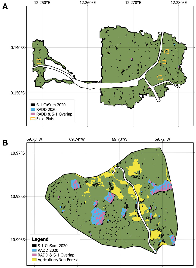 The study presented here employs a change detection method based on the cumulative sums (CuSums) of Sentinel-1 time series, to retrieve information on location, time, and magnitude of small-scale forest disturbance, including selective logging. The method was recently proposed for monitoring forest disturbances (Ruiz-Ramos et al., 2020) and tested on a tropical site with promising results (Ygorra et al., 2021). Here, we validate this novel approach on a unique, ground-measured dataset collected by the Forest Degradation Experiment (FODEX) in Gabon and Peru, using a combination of unoccupied aerial vehicle (UAV) Lidar, Terrestrial Laser Scanning (TLS), and forest inventory data of small-scale disturbances caused by selective logging. In this paper, we adopt the term “forest disturbance” to describe a decrease in forest cover, which may result in the full conversion of forested land into another land type (deforestation) or in an altered ecosystem that still retains the definition of forest (Houghton et al., 2012). This includes natural or anthropogenic causes, such as forest fires, selective logging, forest fragmentation, and edge effects. We prefer to use the term forest disturbance over forest degradation, as the former does not contain any attempt at classifying the fate and the nature of the change event, on which we may not have sufficient information (Beuchle et al., 2021; Reiche et al., 2021). As for “low-intensity disturbance,” we refer to an event that results in the removal of less than 50% of forest biomass per hectare (Houghton et al., 2012). In conclusion, the novelties of the present work are: (1) The validation of a SAR-based change detection algorithm on in-situ measurements of tropical forest loss; (2) the design of an empirically-derived, single change metric for retrieving information on location, time, and magnitude of the disturbance; (3) the possibility of scaling the algorithm on larger areas, which will be addressed in the Discussion section.
