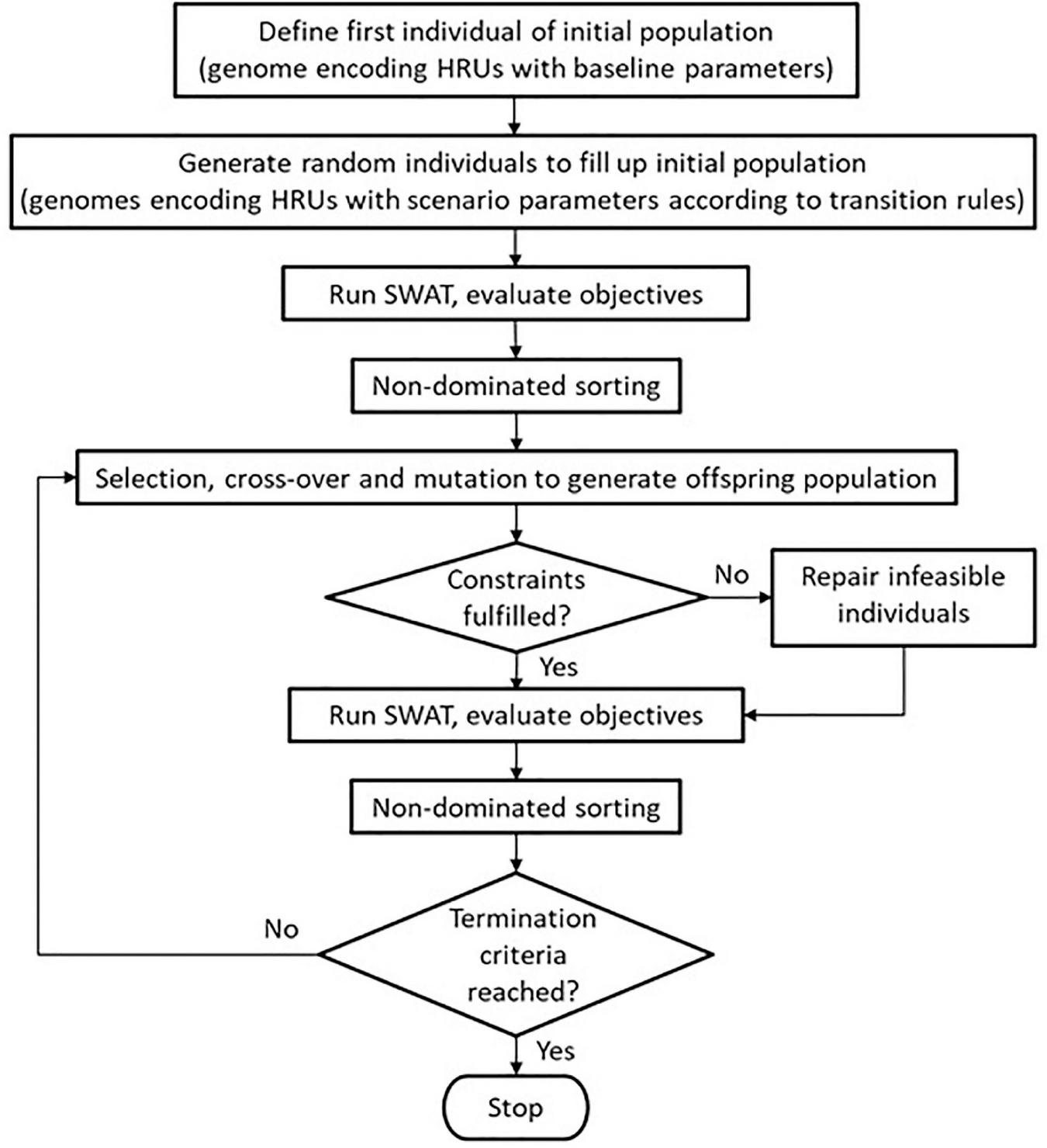 Figure 2 displays a schematic view of the CoMOLA workflow, which is inspired by biological evolution: The group of 98 HRUs with its base scenario setup (conventional agriculture) is defined as the starting individual. Based on the starting individual and the pre-defined transition rules, CoMOLA starts an evolutionary process by creating a set of different HRU configurations. Each HRU configuration is called an individual and is represented by a genome, i.e., a string of integers (n = 98) encoding the land cover and management of each HRU. All individuals of one generation form a population which changes over generations due to selection and variation (i.e., combination and mutation): Using the objective functions described above, each individual is assigned fitness values representing the achieved values for the four objectives, which are derived from running SWAT. Based on their fitness values, the algorithm applies a Pareto ranking for all individuals. Best performing individuals are archived and selected for mating to generate a new (offspring) population. In mating, each offspring individual is generated by a random combination (crossover) of two genomes. The likelihood of mating increases for individuals with a higher Pareto rank. Additional random mutations increase the diversity of genomes to consider a wide range of different HRU configurations. Mating and mutation can result in constraint-violating (so-called “infeasible”) offspring individuals. Genomes of infeasible individuals are modified using a repair operation described in Strauch et al. (2019). The entire procedure, from fitness value calculation to offspring generation and genome repairing, is repeated for a pre-defined number of generations.