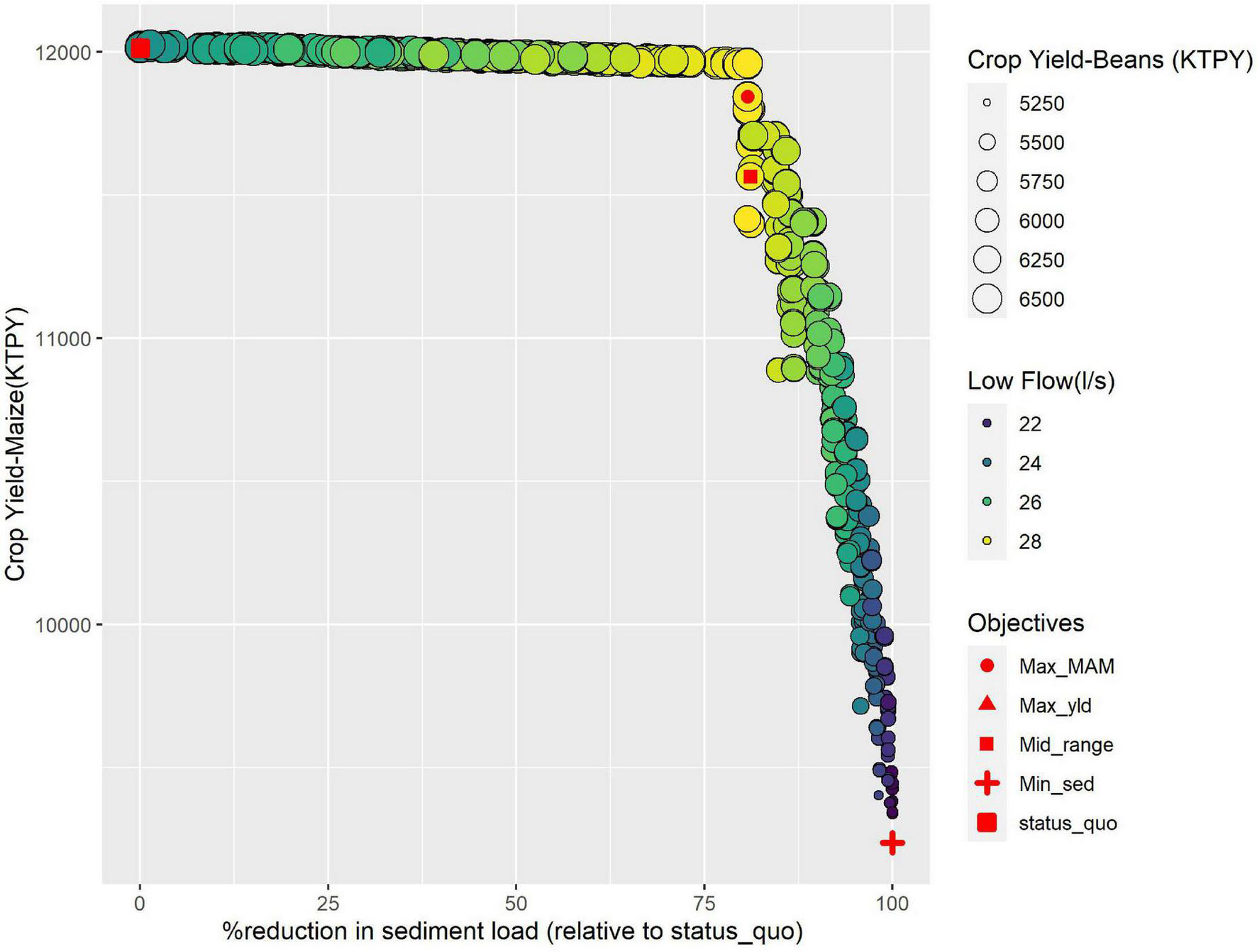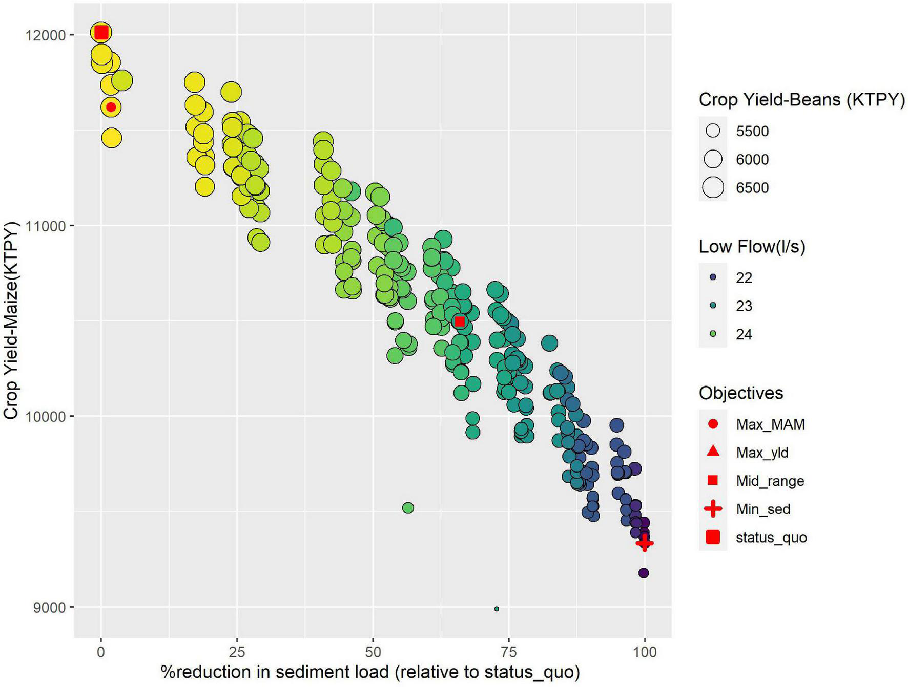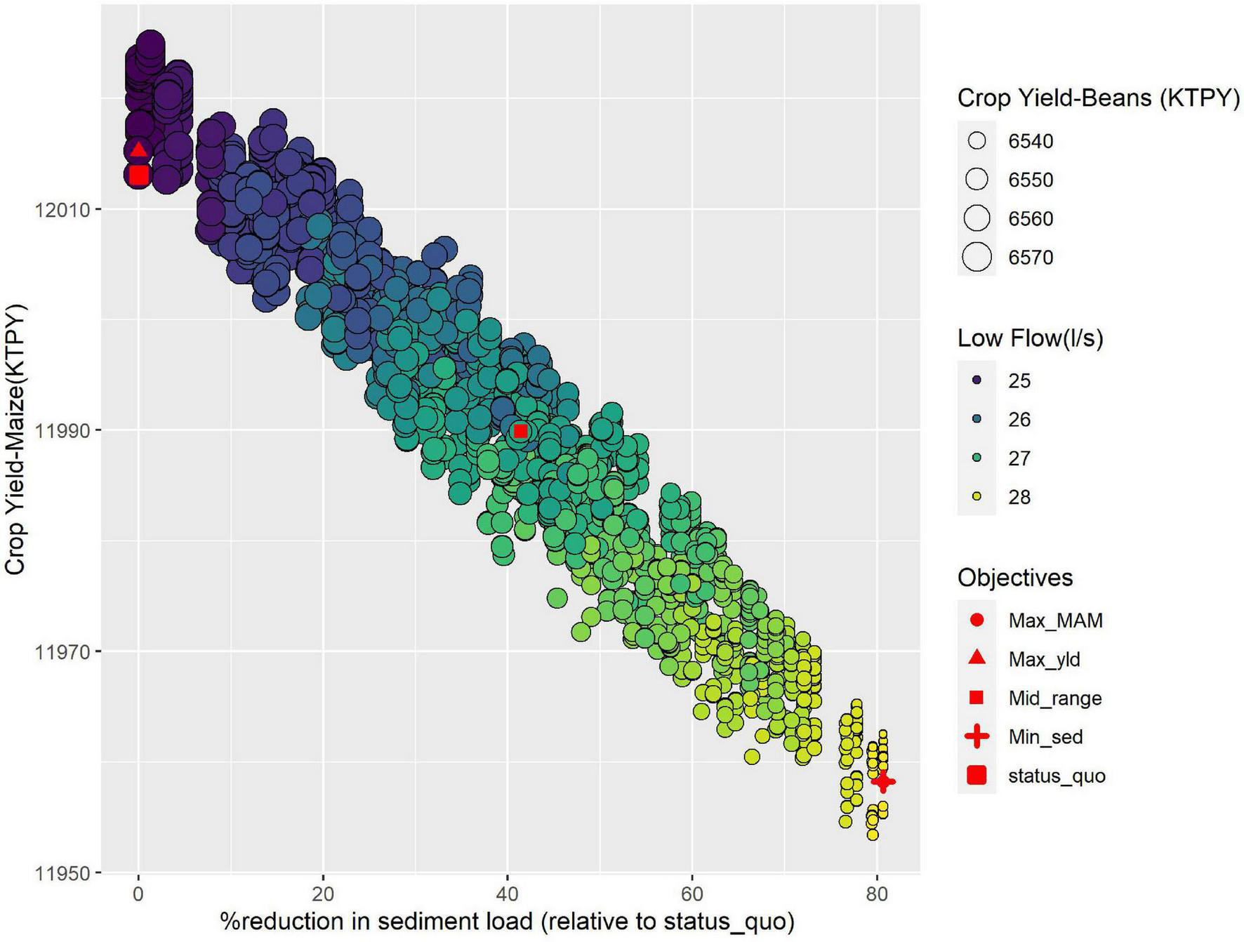 Likewise, Figure 4 illustrated a negative relationship between crop yield and Sed_ld for Scenario 2. At the mid-range position, Sed_ld decreased significantly by 78% while the MAM increased by 14%. Mai_yld and Soy_yld production decreased by 3.8 and 3.4%, respectively. Scenario 3 (Figure 5) showed a comparable loss in crop production. This also resulted in a significantly lower reduction in sediment yield reduction (−41%) and a smaller increase in the MAM (+5%). A similar trend was observed by Kennedy et al. (2016) for a catchment in Brazil. They reported a trade-off between agricultural productivity and both water quality and biodiversity using a greedy heuristic algorithm, which - unlike the genetic algorithm - progressively builds toward a global optimum solution by focusing on local optimum solutions at each stage. Similarly, Femeena et al. (2018) reported a trade-off between food and biofuel production and nutrient pollution (represented as Nitrate and Total Phosphorous). Lee and Lautenbach (2016) assessed the relationships existing among the different ecosystem services and concluded that the relationship between regulating (e.g., sediment load) and most provisioning ecosystem (maize and soybean yield) services is dominated by trade-offs, where the increase of one service happens at the expense of the other.