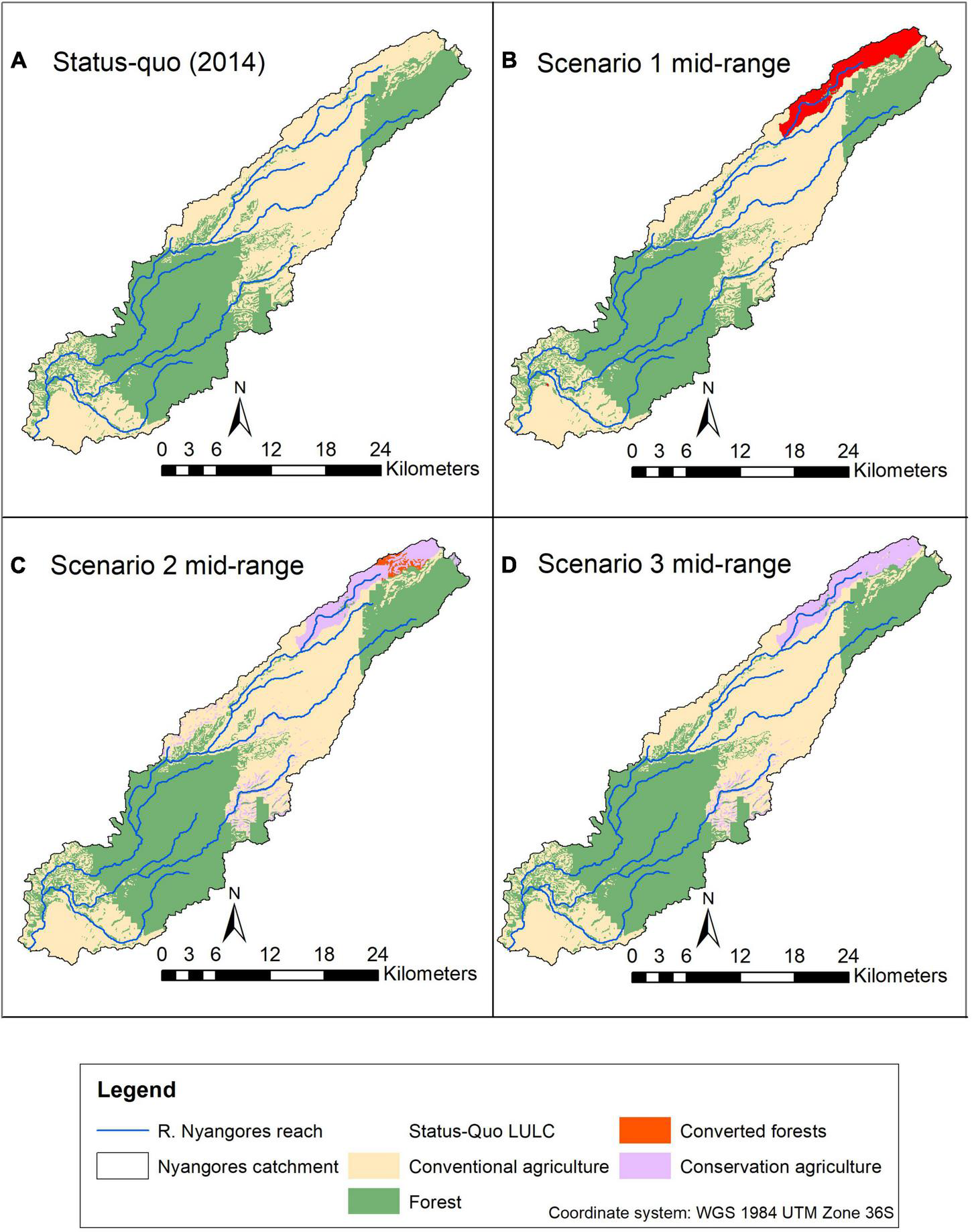 Spatial distribution of the different land-uses for the mid-range solution for Scenario 1 (B), Scenario 2 (C), and Scenario 3 (D), relative to the base Scenario (A).