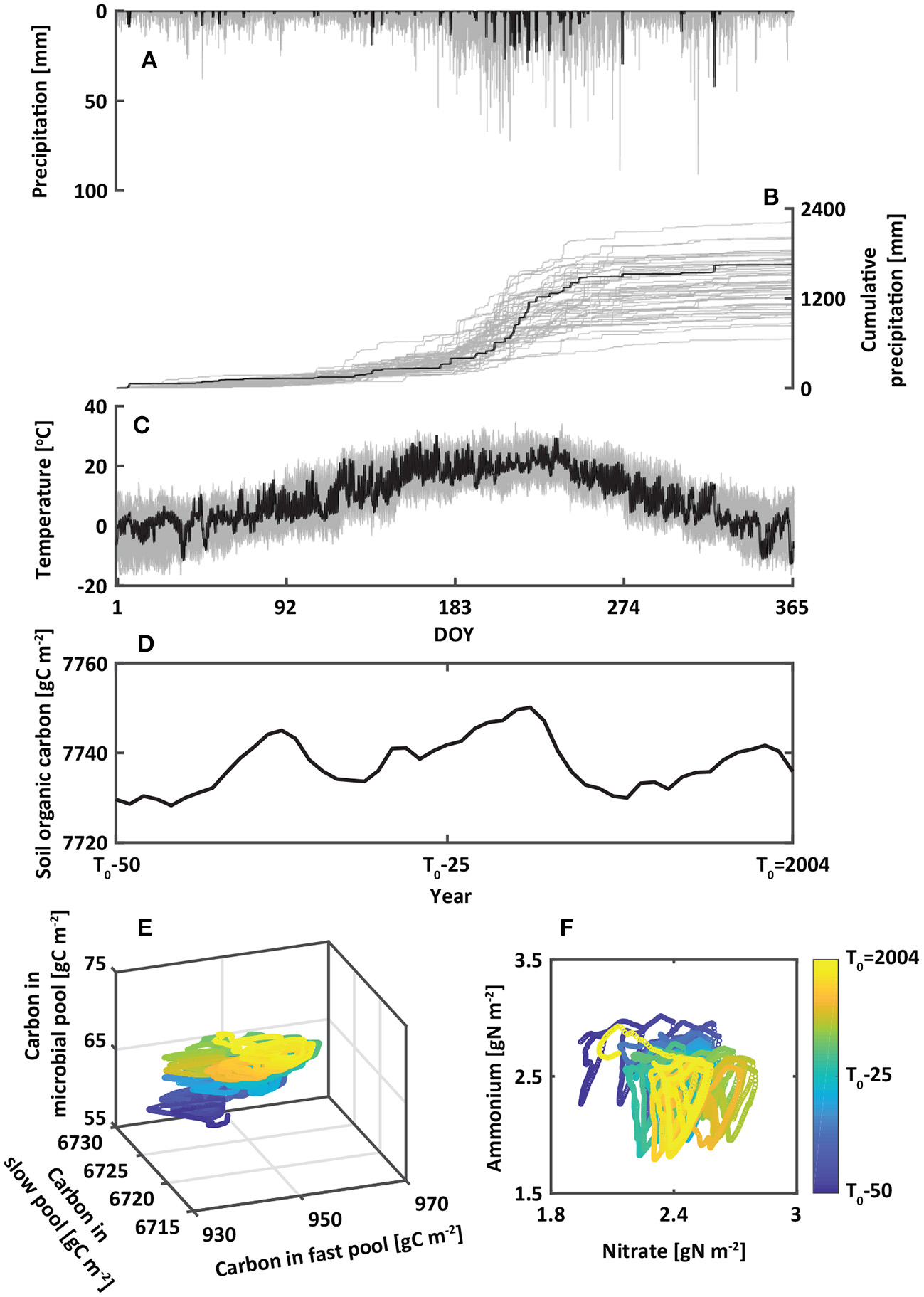 Forcings and initial conditions implemented in the simulation. Observed (A) hourly precipitation, (B) cumulative hourly precipitation, and (C) temperature in 2020 (black) overlaid on the ensemble of generated 50-year weather variables (gray). The nonlinear dynamics in (D) soil organic carbon (SOC), (E) organic carbon pools, and (F) inorganic nitrogen pools during the 50-year spin-up period before 2004 to reach a statistical equilibrium state for initial conditions.