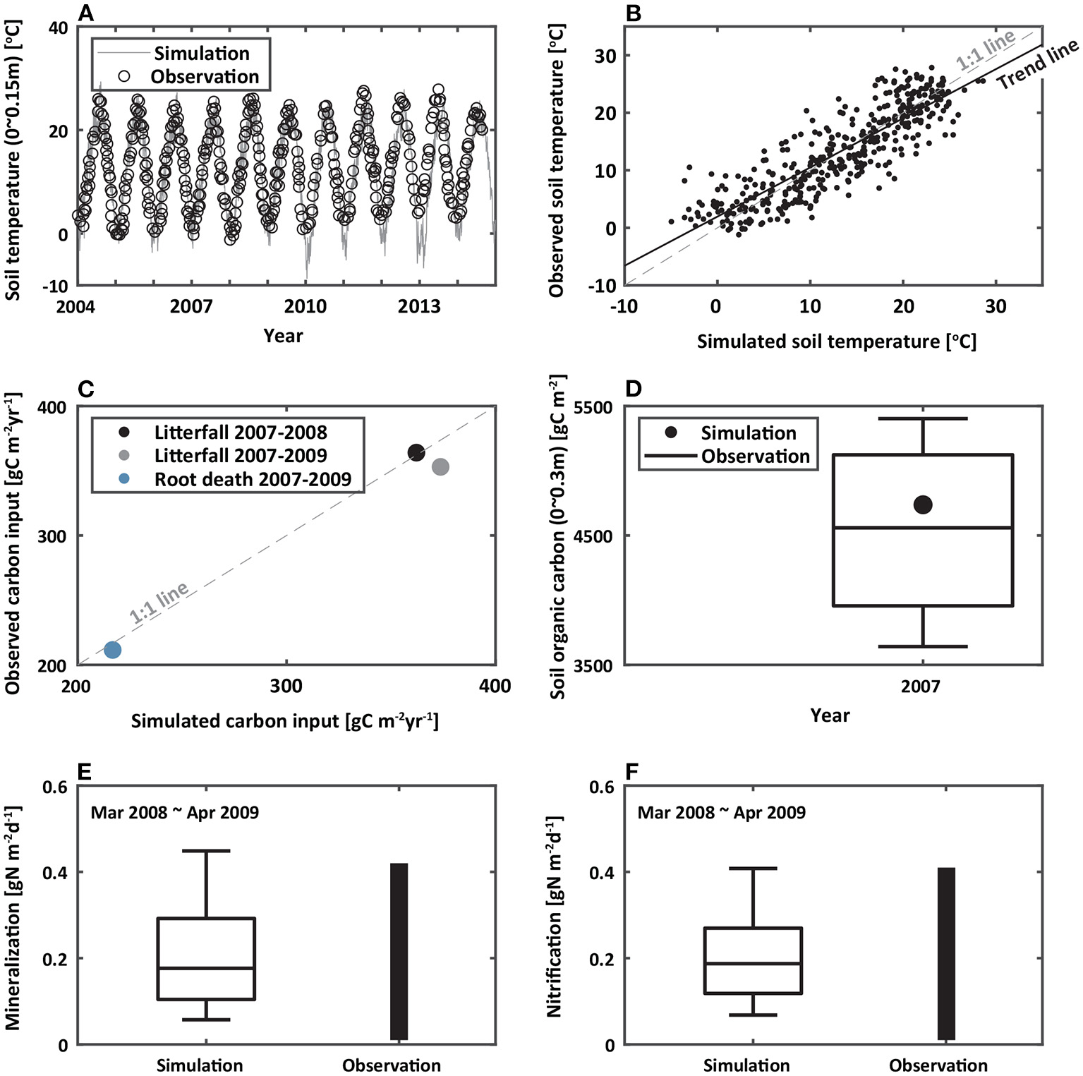 Comparisons of modeled and observed (A,B) soil temperature to a depth of 0.15 m from 2004 to 2015 (Yun and Chun, 2018), (C) carbon inputs from 2007 to 2009 (Lee et al., 2009; Noh et al., 2017), (D) soil organic carbon to a depth of 0.3 m in 2007 (Lee et al., 2009), and (E) mineralization and (F) nitrification to a depth of 0.15 m from 2008 to 2009 (Yoon et al., 2015). The black line in (B) represents the trend line. Gray dashed lines in (B,C) represent a 1:1 relationship. The boxplot in (D) shows the distribution of observed soil organic carbon. The bar plots in (E,F) represent the observed ranges of mineralization and nitrification, respectively.