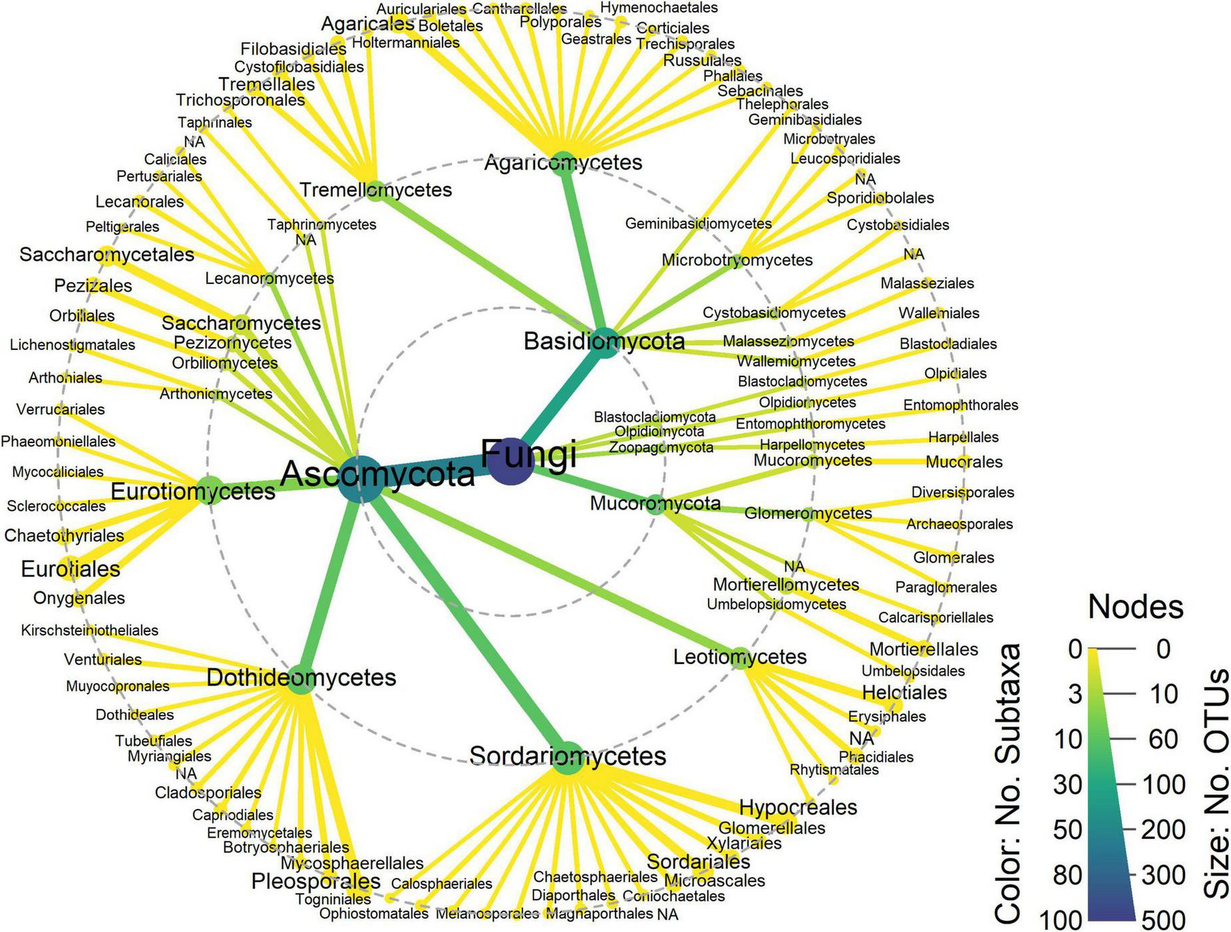 Taxonomic heat tree. Node size represents the number of OTUs and color scale represents the number of subtaxa. Dashed gray circles indicate the following taxonomic levels: phylum (inner), class (middle), order (outer). NA, not assigned.