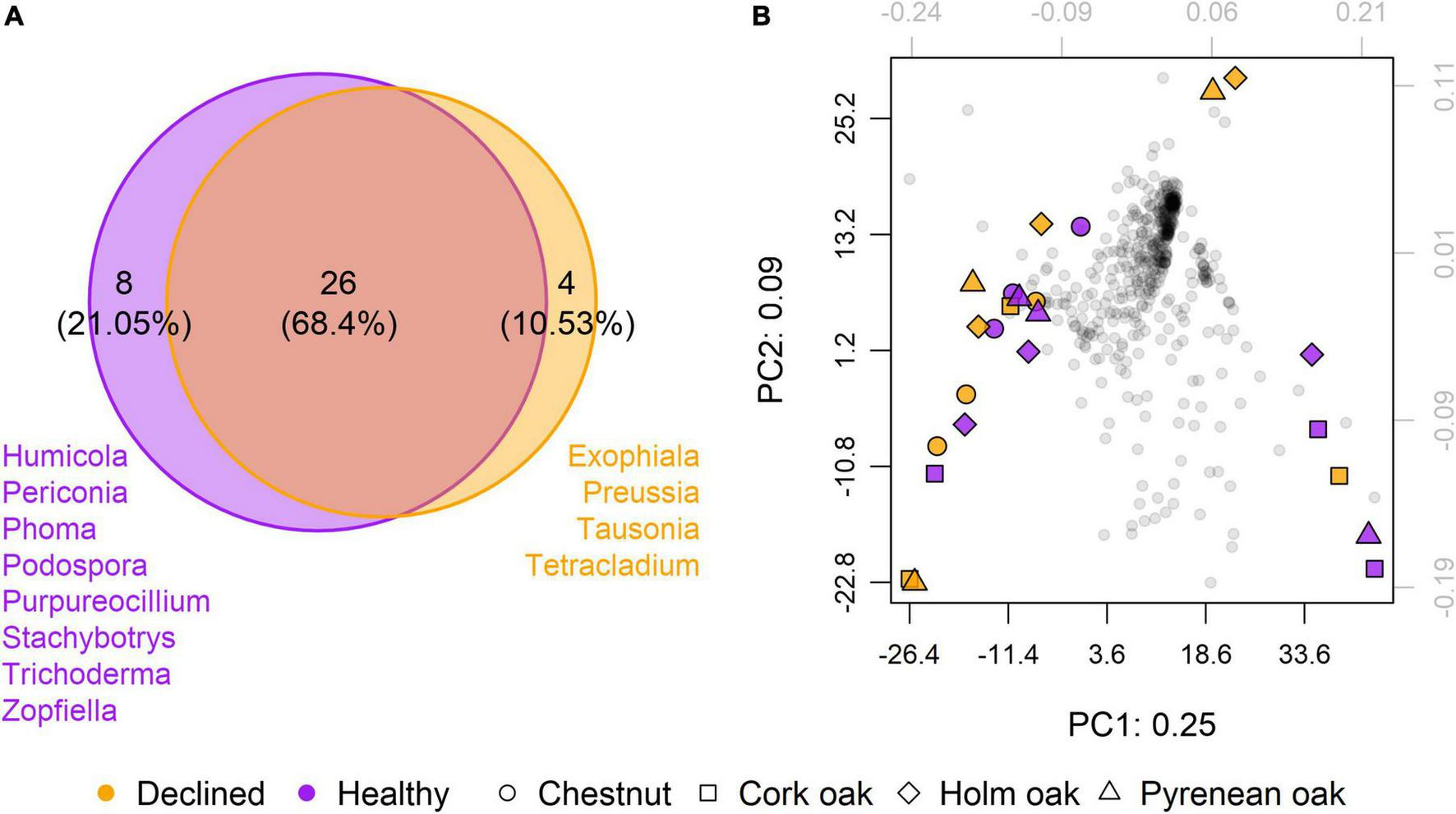 Overall effect of health status on mycobiota. (A) Venn’s diagram showing the number of common and exclusive genera between samples from healthy (n = 12) and diseased (n = 12) trees. Only genera present in at least 10 out of 12 samples per condition are included. (B) Principal components analysis (PCA) of presence/absence based on clr-transformed abundances. Gray dots correspond to genera. Colored dots correspond to samples. Total variance explained by the first two dimensions is 35%.