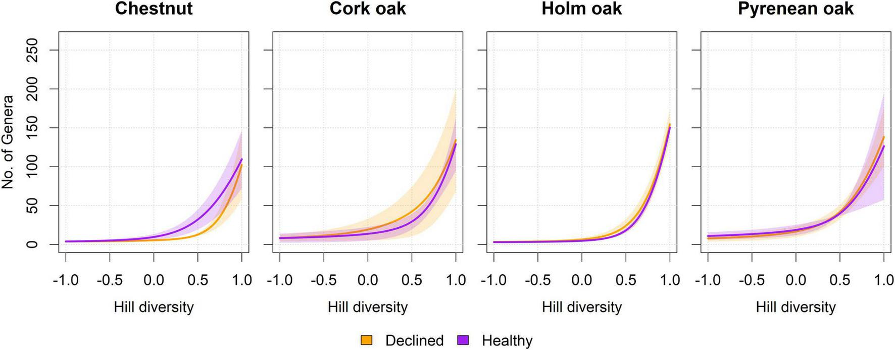 Diversity profiles per tree species and health status. Curves represent the average diversity in samples from healthy and declined trees, in terms of an imaginary assemblage with that same diversity, but in which all species are equally abundant (Jost, 2006; Roswell et al., 2021). The horizontal axis represents the exponent l of Hill diversity, which can be interpreted as equivalence-corrected versions for richness (l = 1), Shannon (l = 0), and Simpson (l = –1) diversity estimators. Shadowed intervals correspond to standard error. No significant differences were found at l = [1, 0, –1] (Wilcoxon test, n = 3 per tree species and health condition, p > 0.05). Raw curves prior to averaging can be found in Supplementary Figure 3.