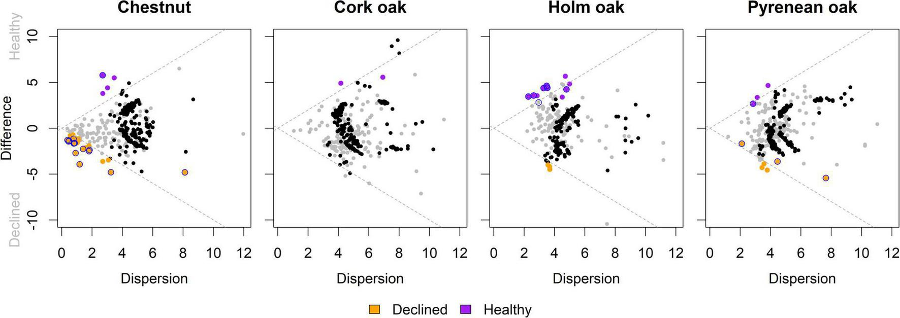 Effect plot of ALDEx differential abundance comparisons. Colored dots represent genera with effect size >1 (purple if more abundant in samples from healthy trees and orange if more abundant in samples from declined trees); blue outline indicates differential abundance (zero not included in 95% CI); rare (clr-transformed abundance < 0) non significant genera are shown in black and abundant (clr-transformed abundance > 0) in grey, as represented in the Bland–Altmann plots in Supplementary Figure 4. Dotted gray lines show the effect = 1 isopleth. Vertical and horizontal axes represent Median Log2 transformations of abundances’ difference (between samples variability) and dispersion (within samples variability), respectively.