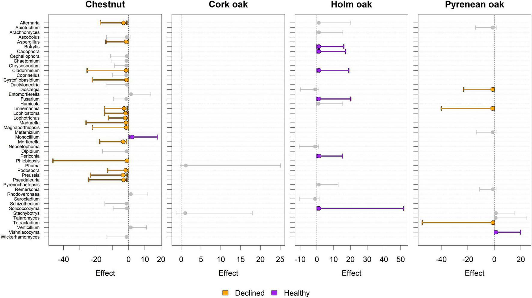Beta diversity was evaluated in terms of differences in fungal composition using log ratio-transformed values of raw reads. Differentially abundant (DA) genera between healthy and diseased samples were found in chestnut (15), holm oak (6), and pyrenean oak (4) trees, but not in cork oak (Figure 6). Identities of DA genera, alongside the corresponding effect estimator and 95%CI are shown in Figure 7. DA genera were more prominently found in samples from declined trees of chestnut and pyrenean oak, and in samples from healthy trees of holm oak.