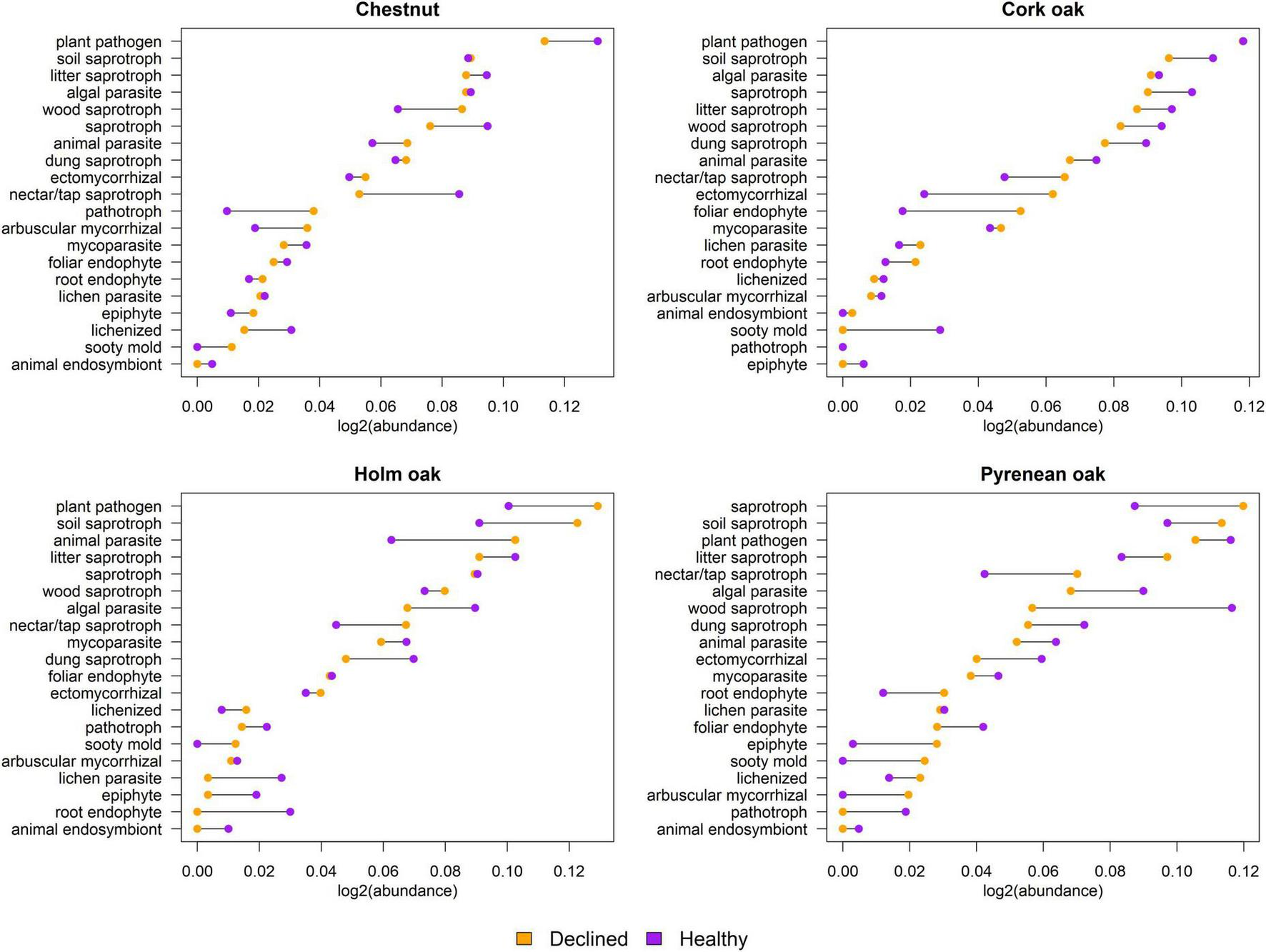 Comparison of functional guilds between declined and healthy samples. Horizontal axis represents sum of abundances expressed as log2 (guild abundance/total abundance). Connecting lines between two dots correspond to the difference between declined and healthy samples.