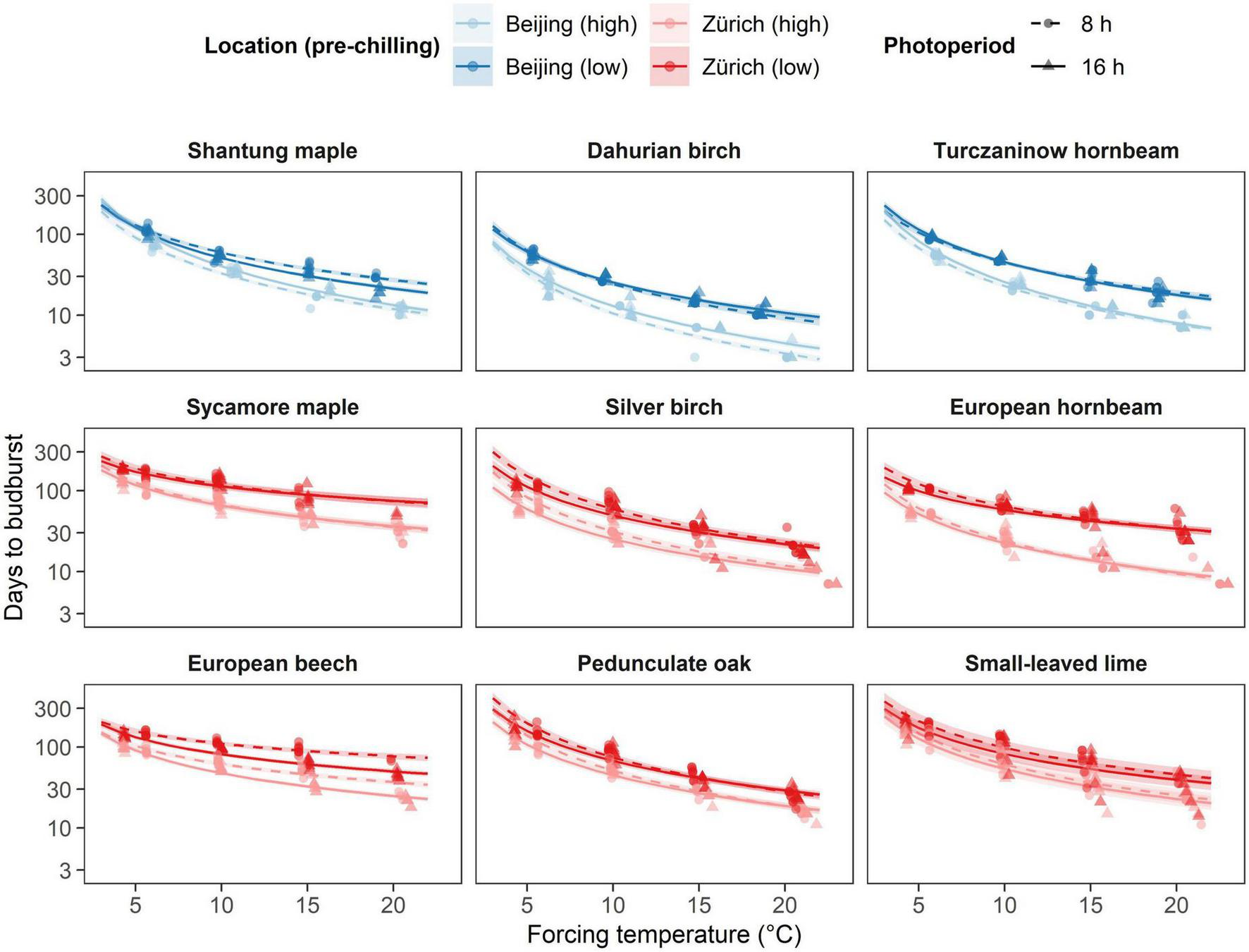 Effect of the different temperature treatments (forcing) on time to budburst (days) under different pre-chilling conditions and photoperiod. The predicted relationships from the final model are represented as solid lines with corresponding 0.89 credible intervals. Chilling treatments and locations are represented by colors, where blue indicated species growing near Beijing and red indicates species growing near Zurich. Pre-chilling conditions are indicated with lower brightness (high pre-chilling) and higher brightness (lower pre-chilling), whereas photoperiodic treatments are represented by solid lines and triangles (16 h photoperiod) and dashed lines and points (8 h photoperiod).