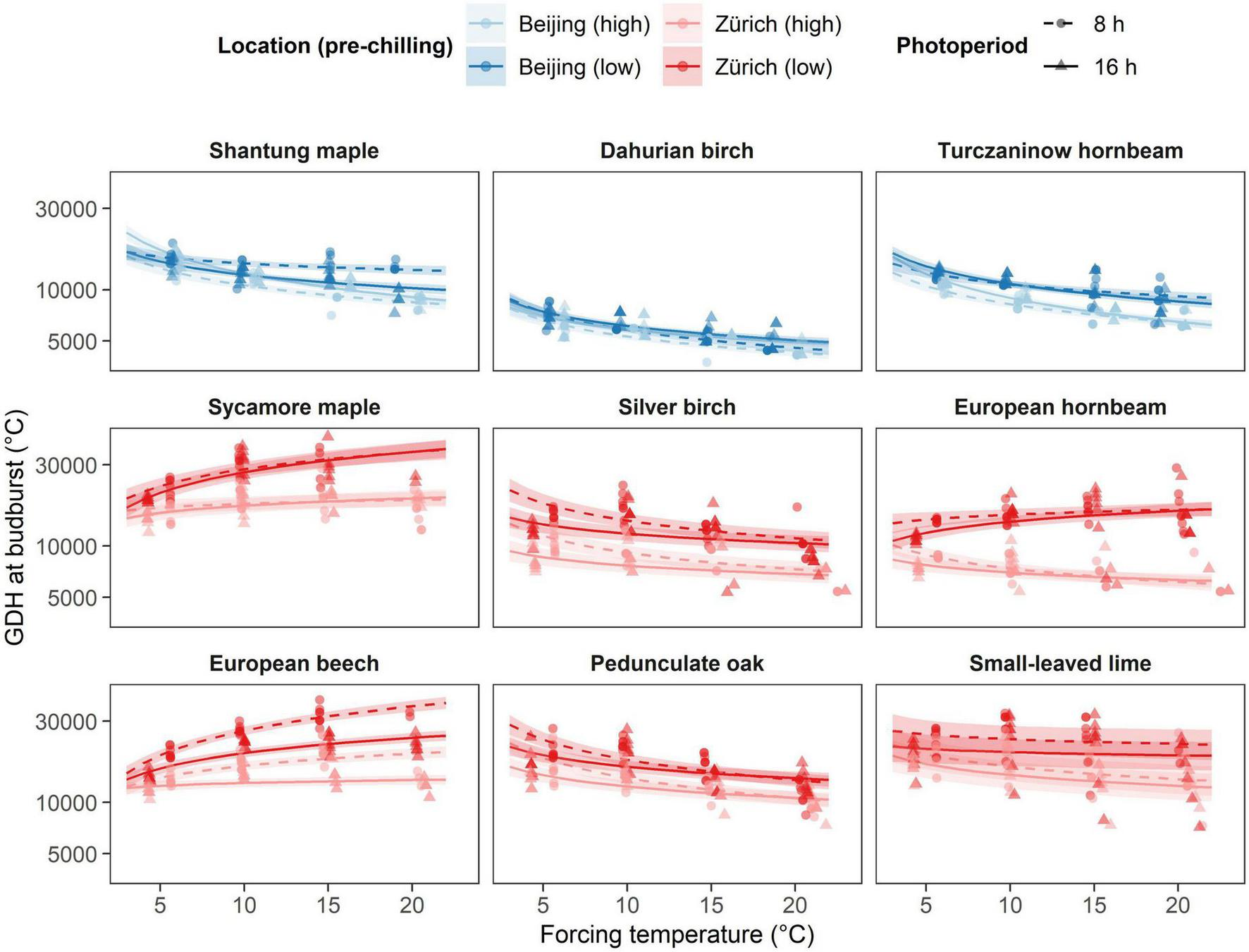 Effect of the different temperature treatments (forcing) on growing degree hours (GDH) under different pre-chilling conditions and photoperiod. The predicted relationships from the final model are represented as solid lines with corresponding 0.89 credible intervals. Chilling treatments and locations are represented by colors, where blue indicated species growing near Beijing and red indicates species growing near Zurich. Pre-chilling conditions are indicated with lower brightness (high pre-chilling) and higher brightness (lower pre-chilling), whereas photoperiodic treatments are represented by solid lines and triangles (16 h photoperiod) and dashed lines and points (8 h photoperiod).