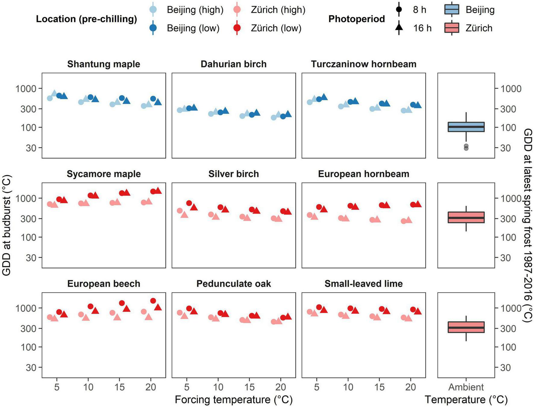 Required GDD to budburst of the nine species investigated under different forcing temperatures, pre-chilling conditions and photoperiod as predicted by the Bayesian mixed effect model (left) and the observed GDD at latest spring frost at the investigated sites (right). Note the higher distance between predicted GDD requirement and observed GDD near Beijing compared to predicted GDD requirement and observed GDD near Zurich. Note also the weaker influence of pre-chilling conditions (brightness) in East Asian species (upper row) compared to Central European species (lower two rows).