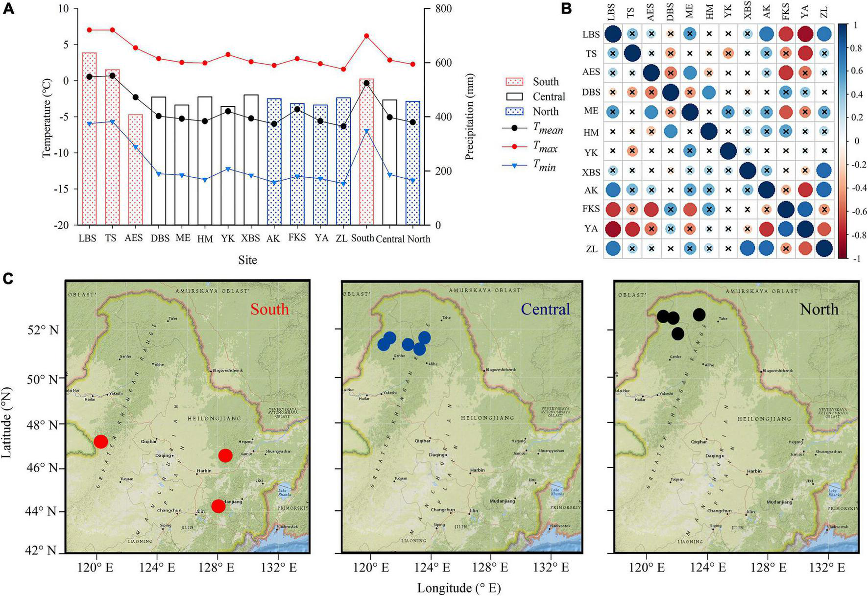 The study area is located in northeastern China. It can be divided into three regions along the latitudinal gradient: south (44.10°–47.22° N, 120.28°–128.48° E), central (51.30°–51.62° N, 120.82°–123.53° E), and north (51.83°–52.59° N, 121.10°–123.52° E) (Table 1, Figure 1). From 2015 to 2018, we conducted field work at 12 sites, which we divided into three regions according to latitude: the southern sites (LBS, TS, AES), the central sites (DBS, ME, HM, YK, XBS), and the northern sites (AK, FKS, YA, ZL) (Table 1, Figure 1). The mean annual total precipitation (1950–2014) in the study area ranges from 415.6 to 636.2 mm (Figure 1A). The mean annual temperature is between −6.3 and 0.5°C. January and July are the coldest (−38.2°C, ZL) and hottest (25.3°C, TS) months, respectively (Table 2).