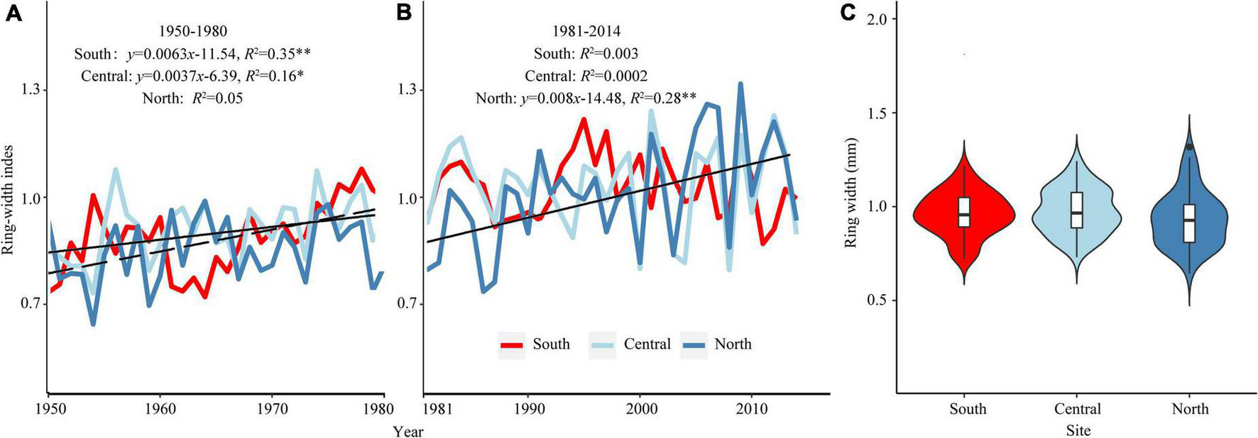 Standard chronologies of different regions (A,B). Violin plot shows the full distribution of data, with white dots referring to the median, and colored dots describing mean shrub-ring width in different regions (C). The range of the black lines in the violins represents the interquartile ranges, and the light bar represents the 95% confidence interval. “**” and “*” represents p < 0.01 and p < 0.05, respectively.