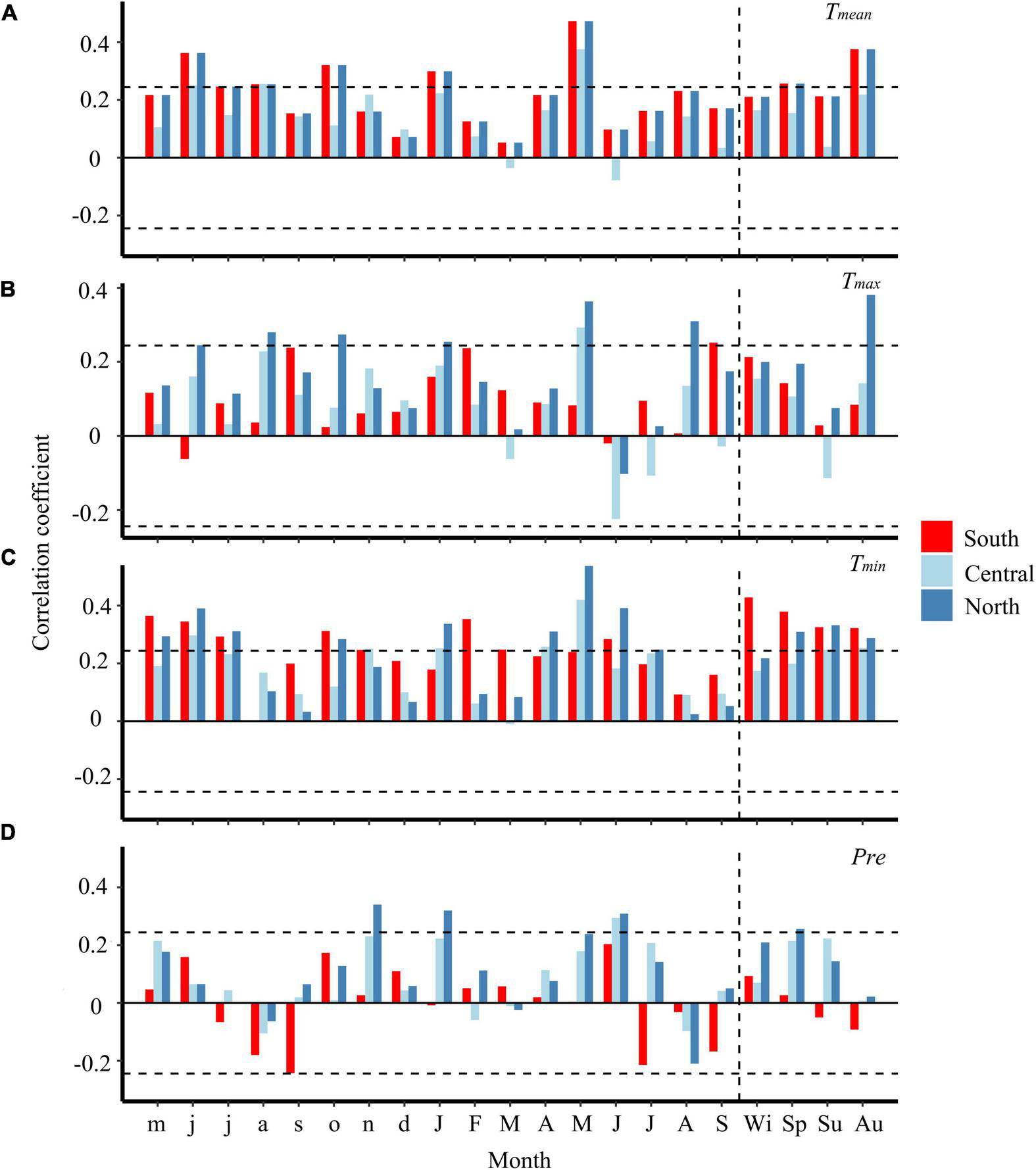 Correlation between regional chronologies and monthly climate factors from 1950 to 2014. Climate parameters include monthly mean temperature (A), maximum temperature (B), minimum temperature (C), and monthly total precipitation (D). Horizontal dash line represents the significance at p < 0.05. Lowercase and uppercase letters on the axis indicate the month of the previous year and the current year. Wi, Sp, Su, and Au represent the prior winter, current spring, summer, and autumn, respectively.