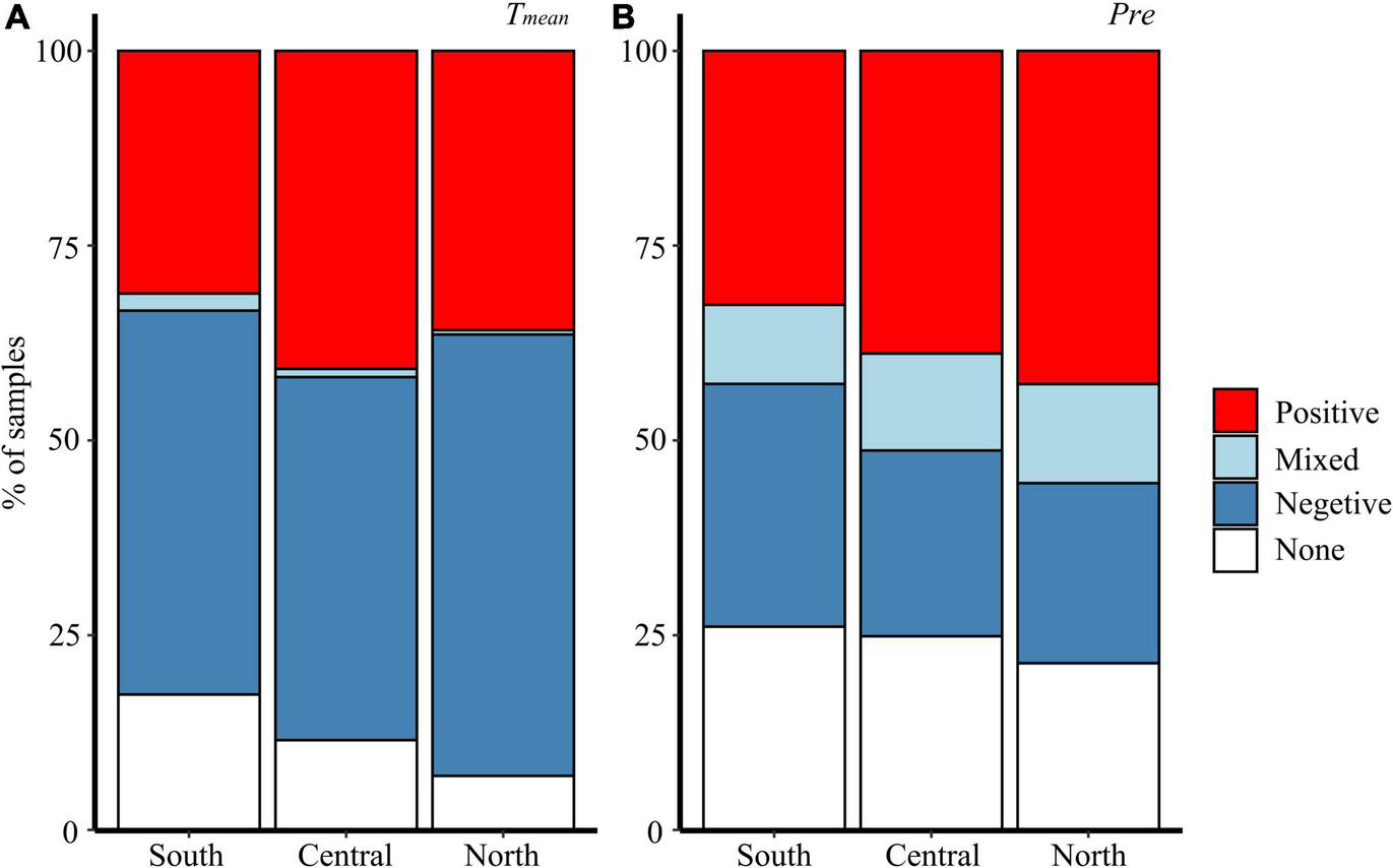 Response pattern to mean temperature (A) and precipitation (B). Response categories are defined in the Methods. Bars indicate the percent of P. pumila at each region in each response category. The site is arranged from the southernmost (LBS) to the northernmost (ZL).