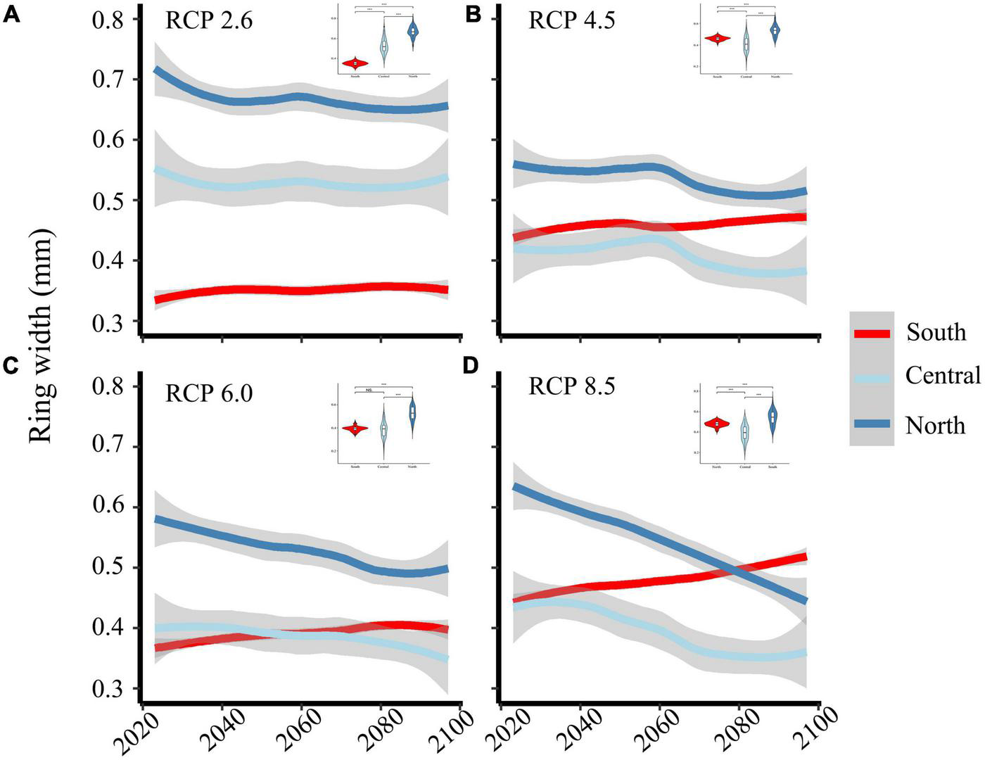 RW growth (RW, ring-width; values are means ± SE) under RCP 2.6 (A), RCP 4.5 (B), RCP 6.0 (C), RCP 8.5 (D) scenarios in each region (red, light blue, and steelblue lines refer to the South, Central, and North, respectively). The violin represents the width of the shrub ring.