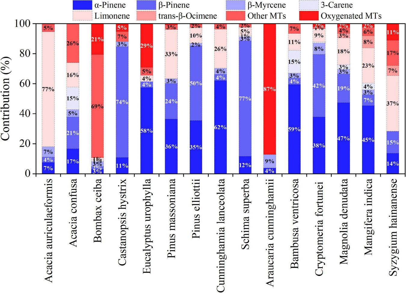 Table 3 shows the Es of 11 MTs and 3 oxygenated MTs emitted from 15 tree species (Supplementary Figure 3), and their compositions are shown in Figure 3. Overall, α-pinene, β-pinene, and limonene were the most common MT species emitted. M. denudata showed the highest Es of α-pinene (8.33 ± 2.05 μg g–1 h–1) and limonene (3.11 ± 1.07 μg g–1h–1), while C. hystrix had the highest Es of β-pinene (5.29 ± 3.24 μg g–1h–1). α-Pinene was the most abundant MT emitted from C. lanceolata (62.1 %), B. ventricose (59.5 %), E. urophylla (57.7 %), M. denudata (47.3 %), M. indica (45.4 %), and P. massoniana (36.5 %) (Figure 3), β-pinene was the dominant MT from S. superba (76.9 %), C. hystrix (73.8 %), P. elliottii (49.8 %), and C. fortune (41.7 %), limonene was the major MT in emissions from A. auriculaeformis (76.6 %) and S. hainanense (37.1 %), camphene was the most abundant MT from B. ceiba (65.2 %), and oxygenated MTs were the most abundant species from A. cunninghamii (87.2%) (Supplementary Table 4). Compositions of MTs from C. lanceolata, which covers a large forest area (10.41 %) in south China, were not characterized before, and in this study, its MT emissions were found to be dominated by α-pinene (62.1 %).
