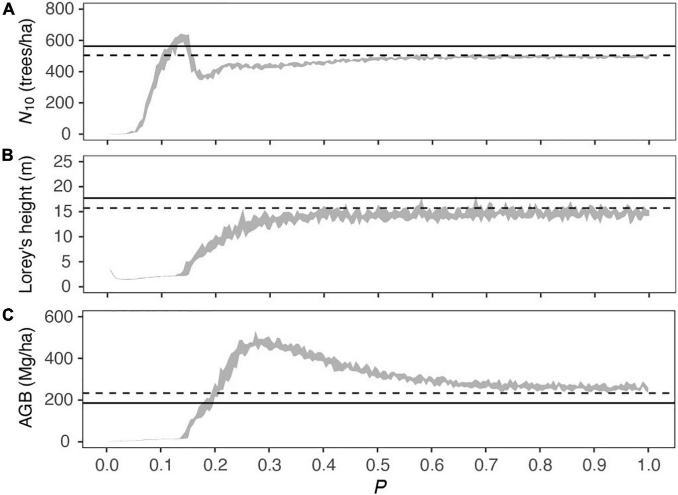 Summary statistics of the simulated forests, in relation to the critical wind speed parameter P (smaller P means stronger effect): (A)N10, density of stems with DBH > 10 cm (trees ha–1); (B) Lorey’s height, basal area-weighted mean tree height (m); (C) AGB, aboveground biomass (Mg ha–1). Shaded areas represent the value range of five replicates for each simulation condition. Dashed lines represent simulation value with no wind disturbance, and Solid lines represent field observations.