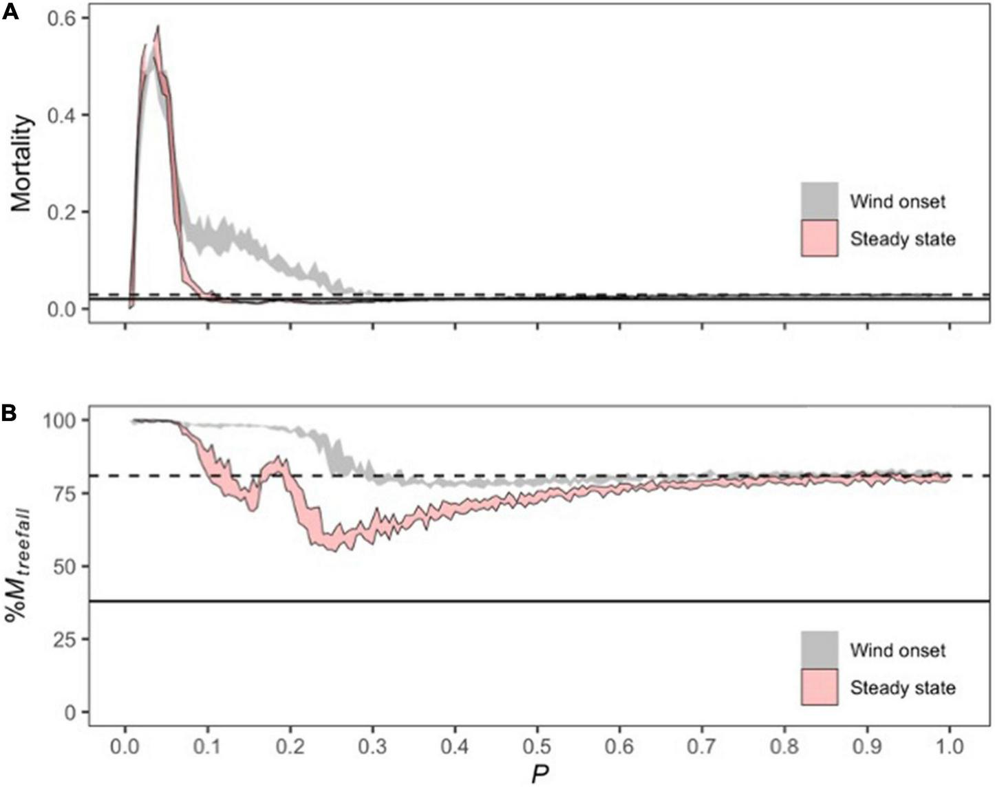 Mean annual mortality and fraction of mortality due to treefalls (%Mtreefall) increased as P decreased, although %Mtreefall exhibited an erratic nonlinear response. Both statistics were markedly lower at the end of the simulation (after the steady state has been reached) than immediately after the onset of wind forcing (Figure 2). The fraction of mortality due to treefalls (%Mtreefall) was overall around 75%, substantially higher than field observations (Figure 2, horizontal black line; Supplementary Appendix A).