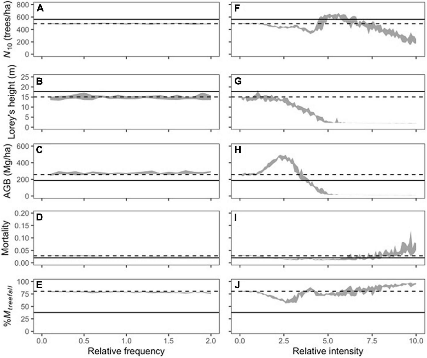Simulated forest structure in relation to extreme wind frequency (A–E) and intensity (F–J), relative to empirical values from cyclone best-track data. For simulations with varying frequency, empirical wind intensity were used, and vice versa. Shaded areas represent the value ranges of five replicates for each simulation condition. (A,F)N10, density of stems with DBH > 10 cm (trees ha–1). (B,G) Lorey’s height, basal area-weighted mean tree height (m). (C,H) AGB, aboveground biomass (Mg ha–1). (D,I) mean annual mortality rate. (E,J) %Mtreefall, fraction of mortality due to treefalls. Dashed lines represent simulation value with no wind disturbance, and solid lines represent field observations.
