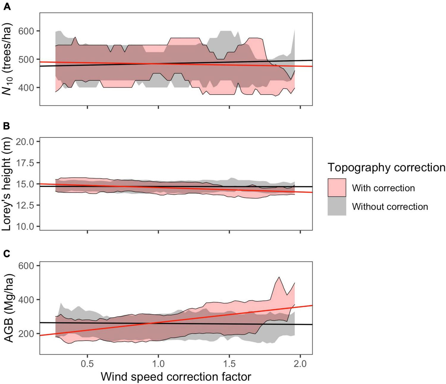 Simulated quadrat-level forest structure statistics as a function of the topography-related wind speed correction factor of each quadrat. A correction factor > 1 means that the quadrat-level wind speed is accelerated,, and a correction factor < 1 means that the quadrat-level wind speed is decelerated. Shaded areas represent interquartile ranges (IQR), calculated within a moving window frame (0.025) across the whole x-axis value range and then linearly interpolated to the x-axis value at each quadrat. Black without border: without topography correction. Red with border: with topography correction. Solid lines represent the linear regression curve. (A) N10, density of stems with DBH > 10 cm (trees ha–1). (B) Lorey’s height, basal area-weighted mean tree height (m). (C) AGB, aboveground biomass (Mg ha–1). For all structure statistics, the quadrat-wide values are converted to the corresponding hectare-wide values.