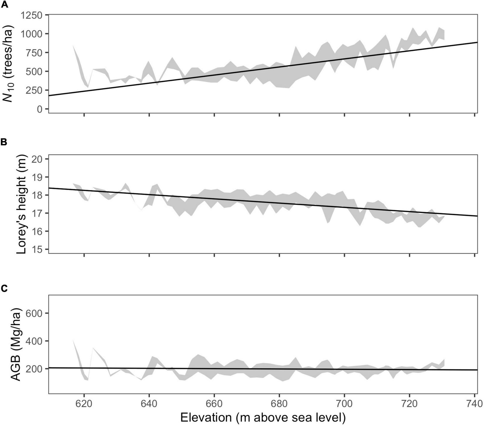 Quadrat-wide (20 m × 20 m) forest summary statistics at the Fushan site, as a function of the quadrat elevation above sea level. Shaded areas represent interquartile ranges (IQR), calculated within a moving window frame (2 m) across the whole x-axis value range and then linearly interpolated to the x-axis value at each quadrat. Solid lines represent the linear regression curve. (A) N10, density of stems with DBH > 10 cm (trees ha–1). (B) Lorey’s height, basal area-weighted mean tree height (m). (C) AGB, aboveground biomass (Mg ha–1). The quadrat-wide values were converted to corresponding hectare-wide values.