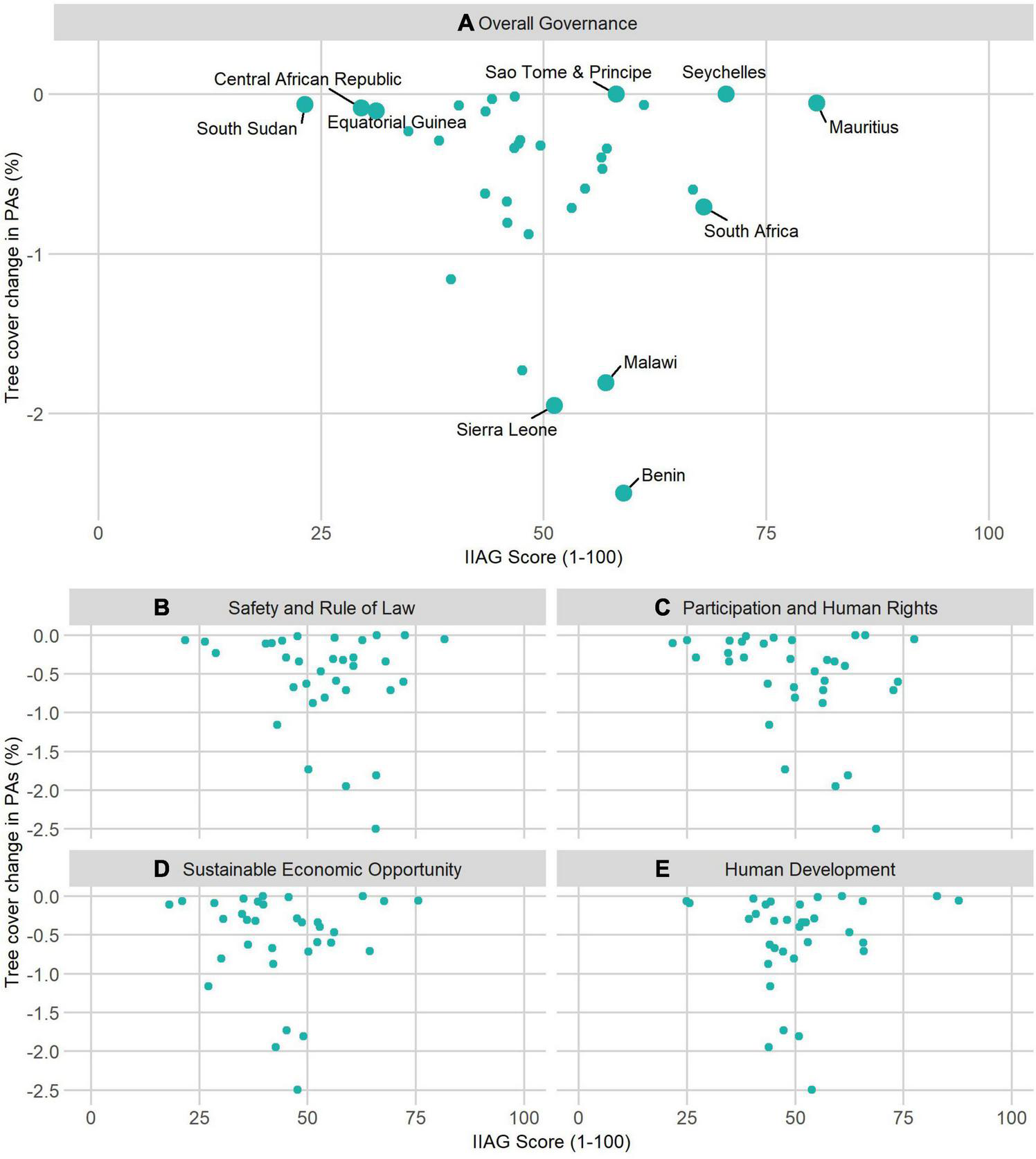 ‘Good governance’ is highlighted by many as being essential for improving protected area (PA) management and conservation outcomes, with a growing body of evidence based on site-level governance data. Yet how exactly governance at other levels supports or hinders successful PA implementation, and how this should be considered in conservation planning and practice, remains insufficiently understood. We conducted an exploratory analysis of the relationship between the quality of country-level governance and trends in tree cover loss within sub-Saharan African PAs. For the period 2008–2017, we correlated annual governance scores from the Ibrahim Index of African Governance (IIAG) with the annual rate of tree cover loss in the total terrestrial area of PAs in 33 forested sub-Saharan African countries. Overall governance was not correlated with tree cover loss in a simple model, but there was evidence that overall governance was positively correlated with tree cover loss in PAs when the interaction with environmental governance was included. The interaction indicated that the rate of tree cover loss decreased for a given level of overall governance as environmental governance increased. Human development was negatively correlated with forest loss. Thus, the relationship between country-level ‘good governance’ and conservation success is more complex than a direct and positive cause and effect. Yet, uncertainty remains about the many possible and likely confounding pathways: whilst the quality of overall governance may be mirrored at the site-level, it may also contribute to increased anthropogenic pressures on natural resources. Through this research we found significant limitations in data quality and availability both to evaluate the effectiveness of protection beyond tree cover, as well as less conventional governance aspects, such as environmental policy and regulation or site-level governance. With an expected increase in area-based protection and conservation financing in the coming decades, such data will be vital to monitor the effectiveness of our efforts and ensure financial accountability.