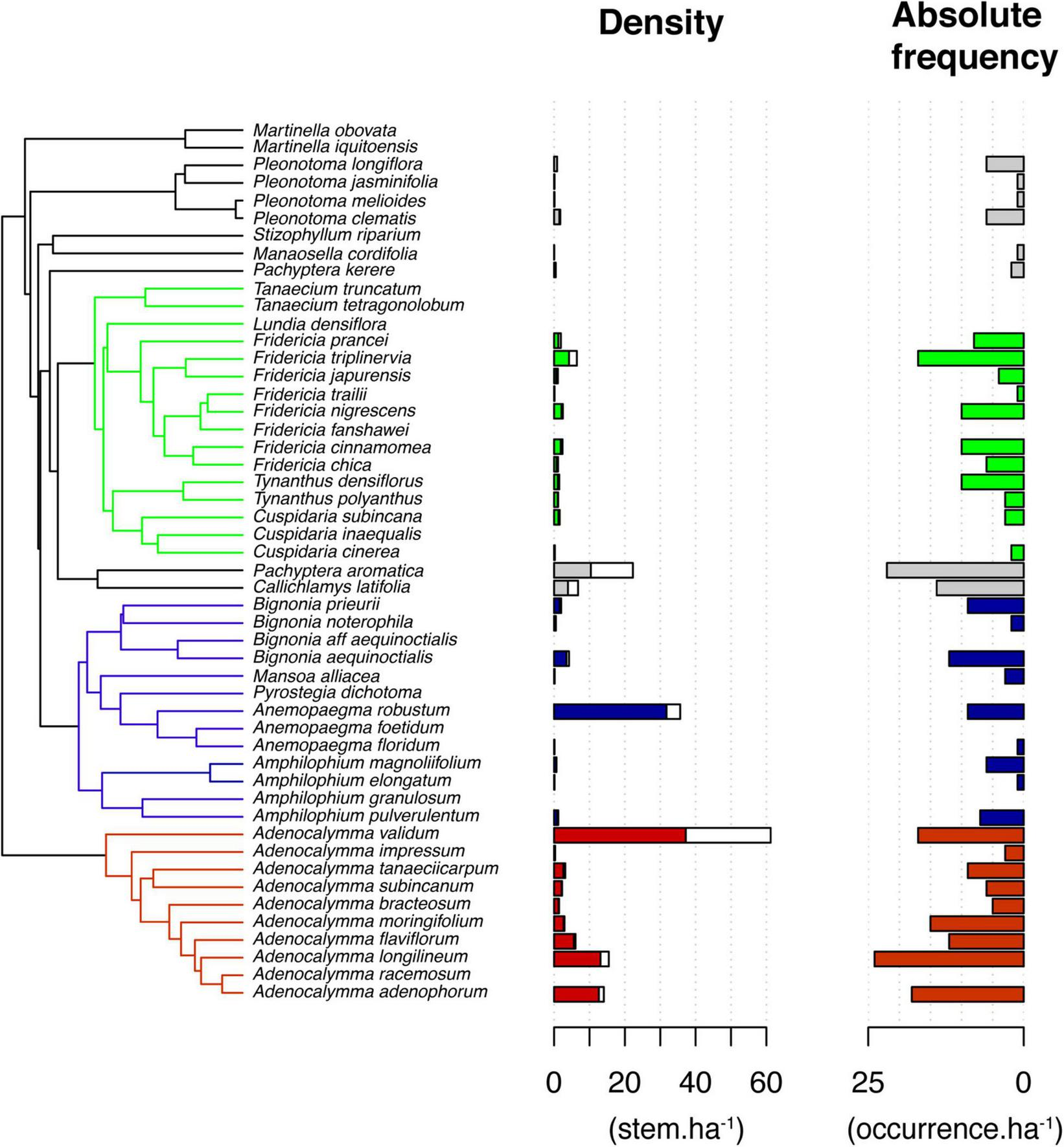 Phylogenetic relationships among the 38 liana species of the tribe Bignonieae (Bignoniaceae) and their stem density (genets in filled bar and ramets in the hollow bar) and absolute frequency in plots sampled at Ducke Reserve (Central Amazon, Brazil). Red, blue, and green highlight the three main clades of the tribe Bignonieae: Adenocalymma, Multiples-of-Four, and Fridericia-and-Allies, respectively.