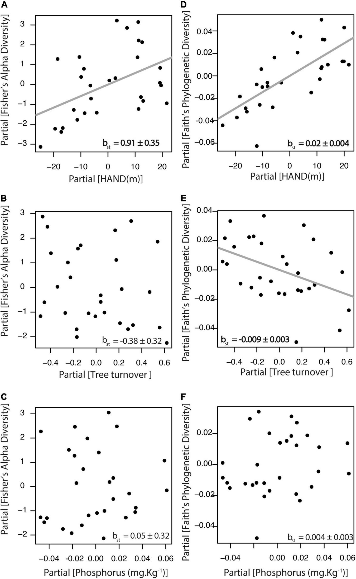 Relationship between liana species diversity and the three environmental gradients at Ducke Reserve (Central Amazon, Brazil). All relationships are partial regressions from models, including HAND (height above the nearest drainage), tree turnover and soil P content as predictive variables. (A–C) Fisher’s alpha diversity index; (D–F) Faith‘s phylogenetic diversity. Gray lines represent significant relationships (p < 0.05), and standardized multiple linear regression coefficients (βst ± SE) are shown in the graphs.